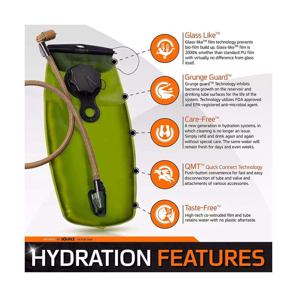 Wszystkie systemy nawadniające Source są łatwe w utrzymaniu i pielęgnacji dzięki unikalnej technologii GlassLike™ i GrungeGuard™. Woda przechowywana w bukłaku smakuje jak woda i pozostaje świeża przez wiele dni, a nawet tygodni - bez smaku plastiku dzięki technologii TasteFree™!