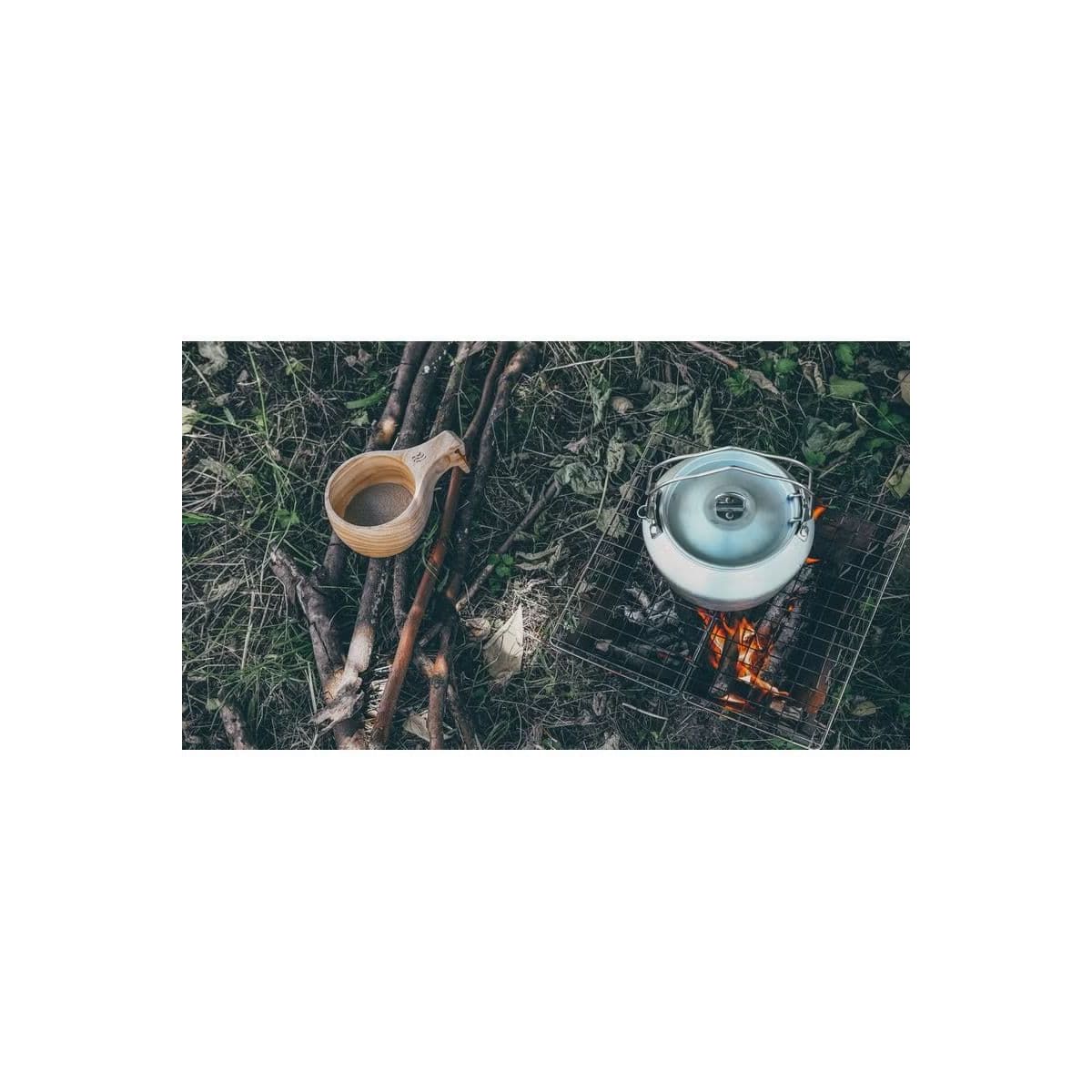 Czajnik oferuje pojemność 1,2 litra, co wystarcza, by zagotować wodę dla kilku osób – idealnie na wspólne śniadanie w naturze. Praktyczny, składany uchwyt pozwala wygodnie powiesić czajnik nad ogniem, a pewne zamknięcie zabezpiecza zawartość podczas gotowania.