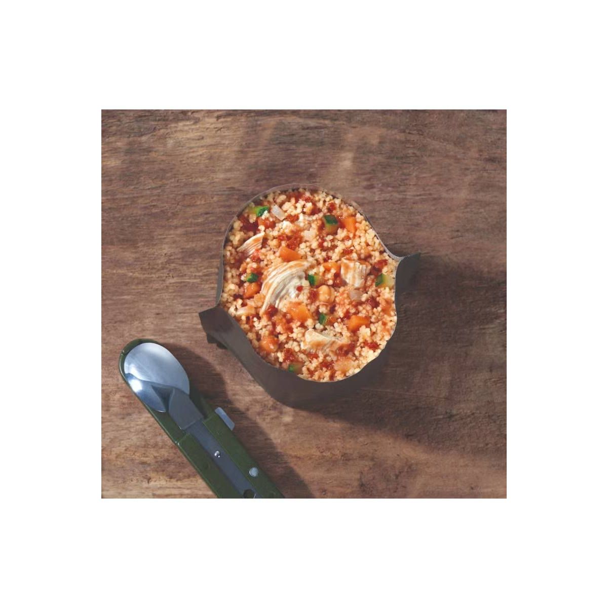 Danie (810) Kuskus z kurczakiem 130 g to prawdziwa gratka dla miłośników orientalnych, pikantnych smaków. Potrawa wzorowana na kuchni marokańskiej jest aromatyczna i sycąca, a liofilizowana postać sprawia, że jest lekka i pakowna. Idealny wybór na trekking, trening, wyprawę rowerową czy kajakową albo w podróż.