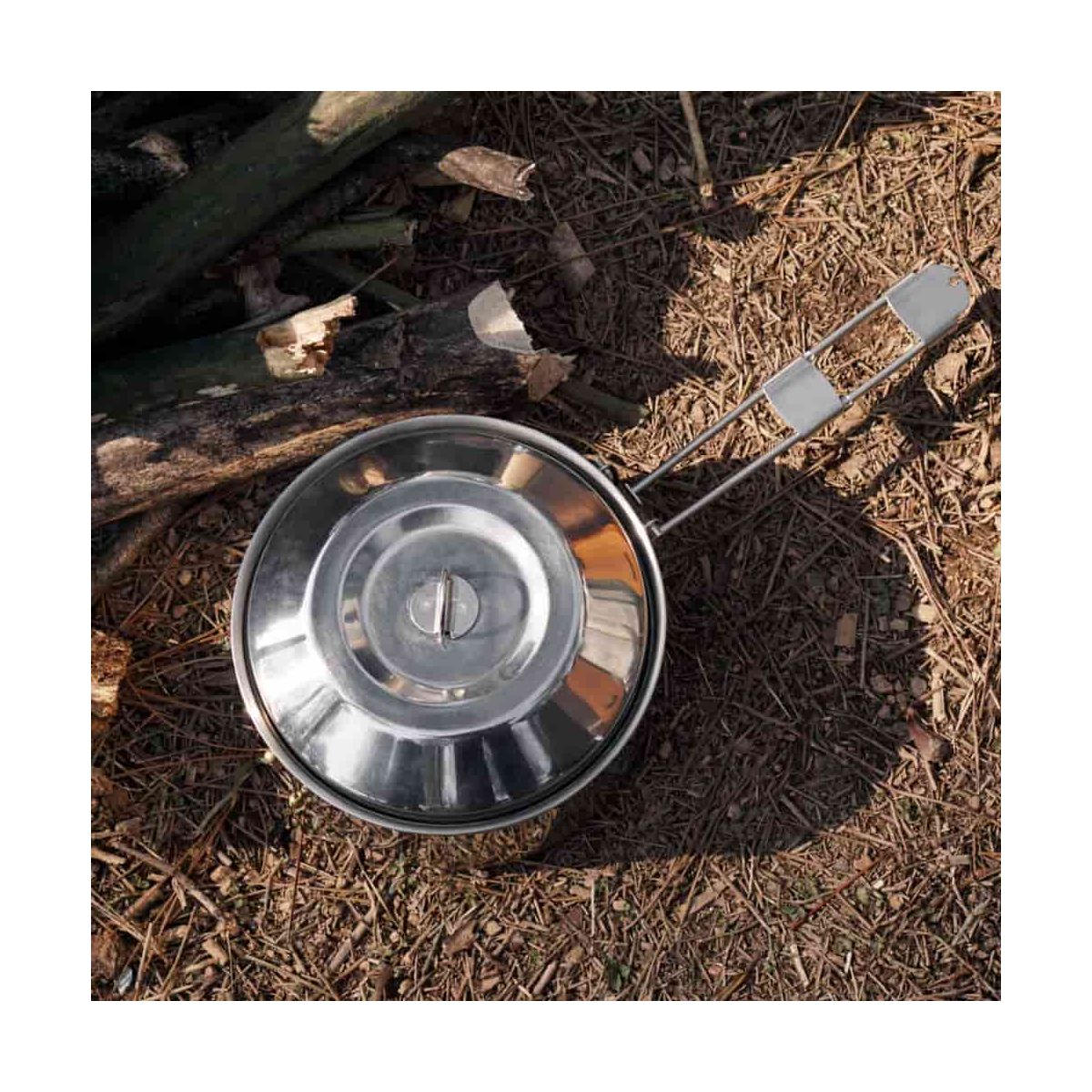 Garnek wyposażono w stalową pokrywkę z uchwytem i składaną rączkę, która ułatwia gotowanie oraz zabezpiecza pokrywę w transporcie. Możesz z niego korzystać na palniku, kuchence z płytą, a nawet bezpośrednio nad ogniskiem.