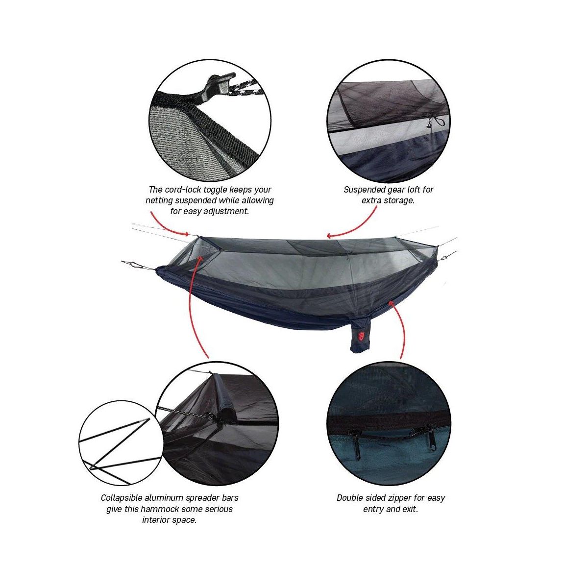 Moskitiera wyposażona jest w dwie linki i system naciągu pozwalający łatwo regulować jej wysokość i napięcie. Dwa elementy stelaża na jej krańcach zapewniają odpowiednią przestrzeń wewnątrz hamaka. Po środku moskitiery znajduje się półeczka na drobne akcesoria biwakowe. Jeśli moskitiera nie jest potrzebna, można ją wywinąć pod hamak i cieszyć się słońcem na twarzy.