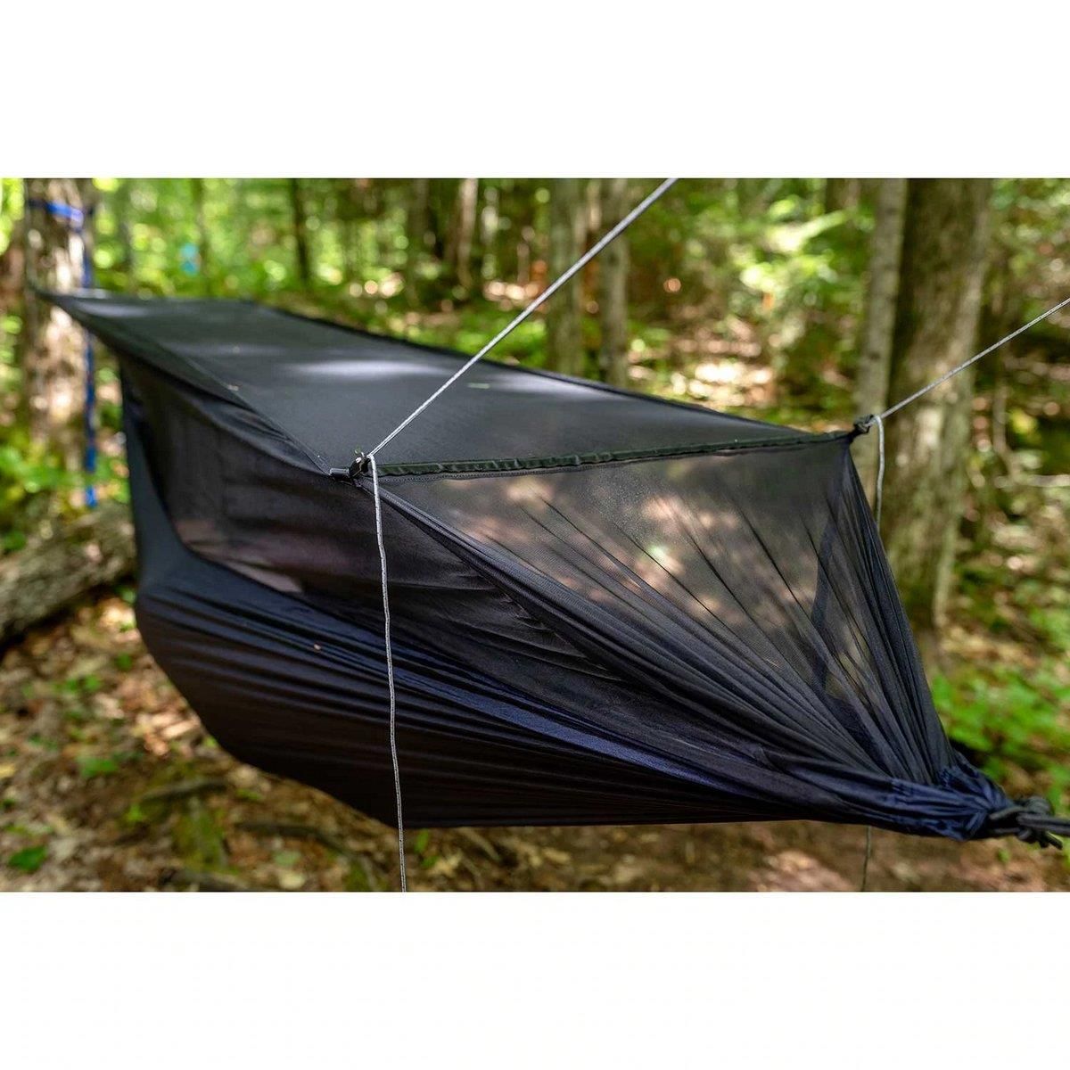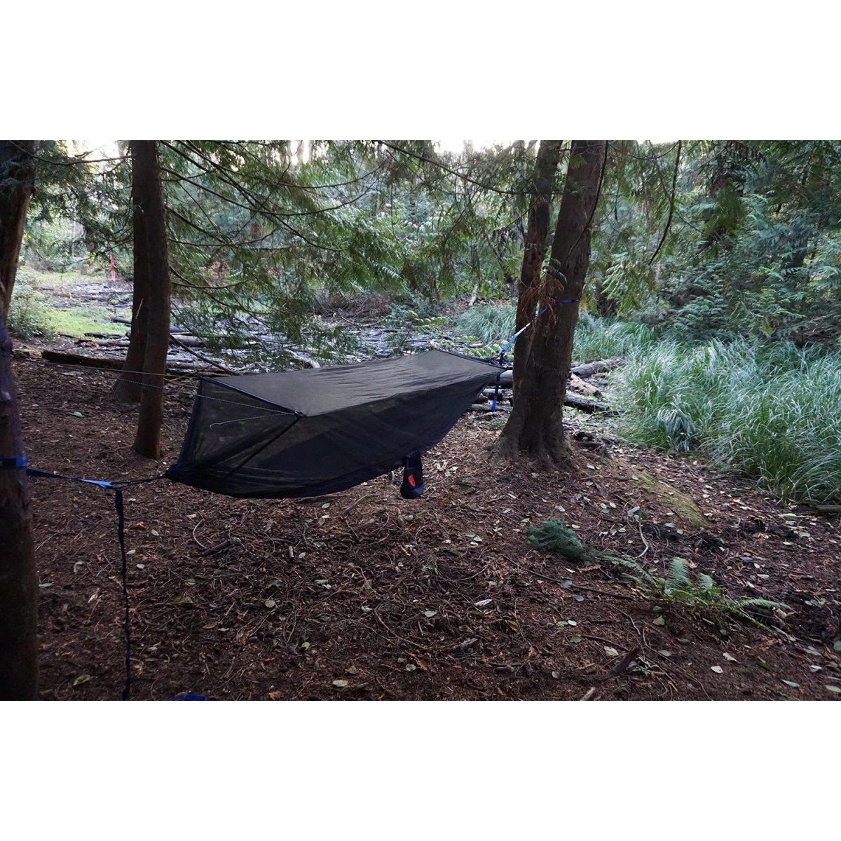 Moskitiera wyposażona jest w dwie linki i system naciągu pozwalający łatwo regulować jej wysokość i napięcie. Dwa elementy stelaża na jej krańcach zapewniają odpowiednią przestrzeń wewnątrz hamaka. Po środku moskitiery znajduje się półeczka na drobne akcesoria biwakowe. Jeśli moskitiera nie jest potrzebna, można ją wywinąć pod hamak i cieszyć się słońcem na twarzy.