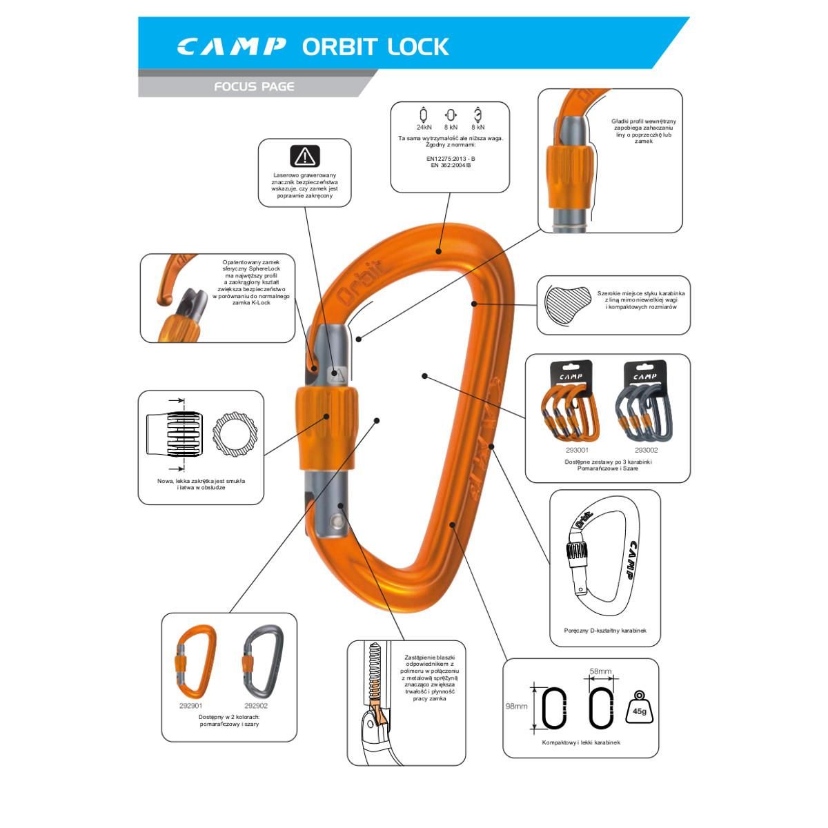 Karabinek Orbit Lock łącz w sobie wytrzymałość i solidność posiadając przy tym wyjątkowo praktyczny, niewielki rozmiar. Znajduje swoje zastosowanie na stanowisku, autoasekuracji, oraz jako karabinek do półautomatycznych przyrządów asekuracyjnych. W tym aspekcie sprawdza się dużo lepiej od tradycyjnych karabinków typu HMS.