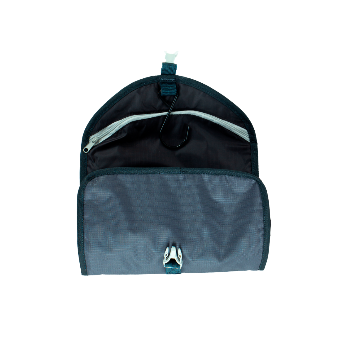 Integralną częścią kosmetyczki jest plastikowa klamra, ułatwiająca jej zamknięcie i kompresję po złożeniu. Do tego dochodzi metalowy hak, dzięki któremu - w zależności od potrzeby - można kosmetyczkę zawiesić na drzewie lub na szafce.