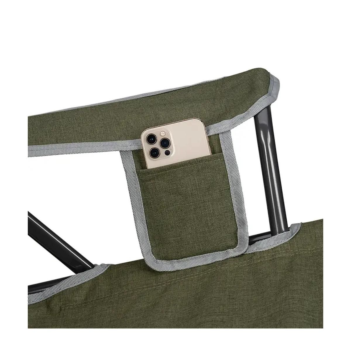 Zintegrowany pasek do noszenia, uchwyt na napój i kieszeń na telefon sprawiają, że to idealny towarzysz wypoczynku – od ogniska po plażę. Solidna konstrukcja i składana forma ułatwiają transport i przechowywanie.