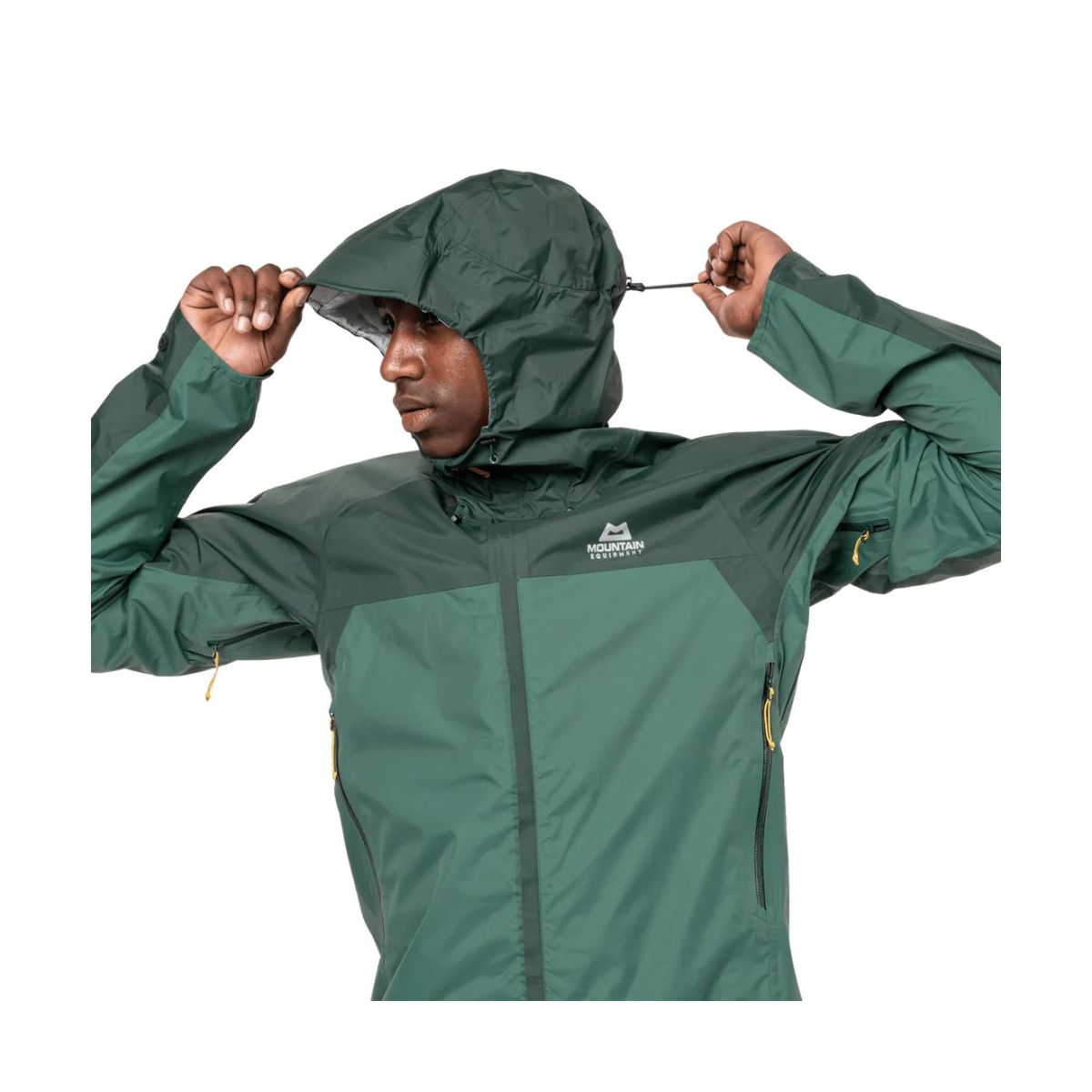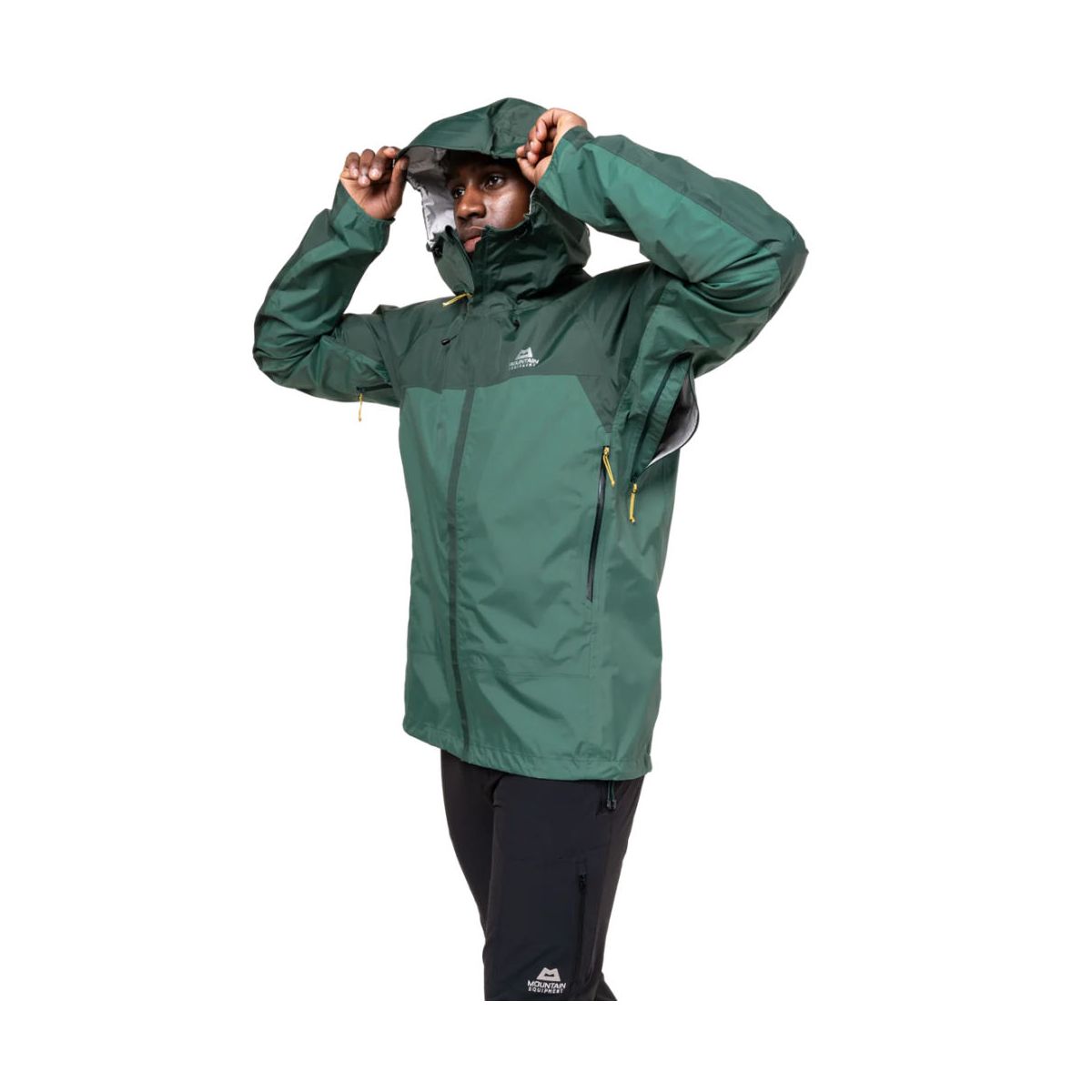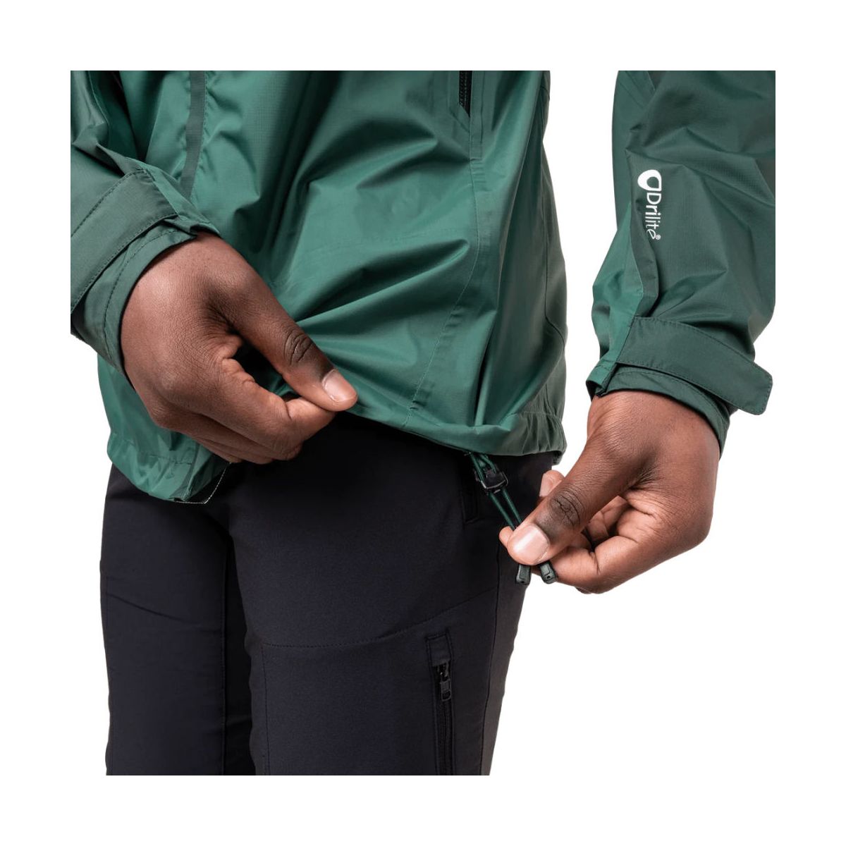 Pełni regulowany kaptur Mountain Hood, laminowane mankiety i dwustopniowa regulacja dołu gwarantują skuteczną ochronę przed wiatrem i wilgocią. Boczne kieszenie oraz ukryte zamki wentylacyjne pod pachami pozwalają na kontrolę temperatury i odprowadzanie nadmiaru wilgoci podczas intensywnego ruchu.