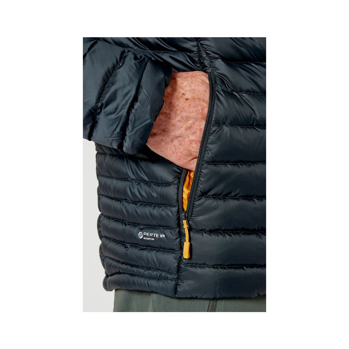Materiał zewnętrzny to wytrzymały, odporny na działanie wiatru Pertex® Quantum, dodatkowo pokryty impregnacją DWR, która powoduje skraplanie się wody, dzięki czemu tkanina zewnętrzna nie wchłania wilgoci.