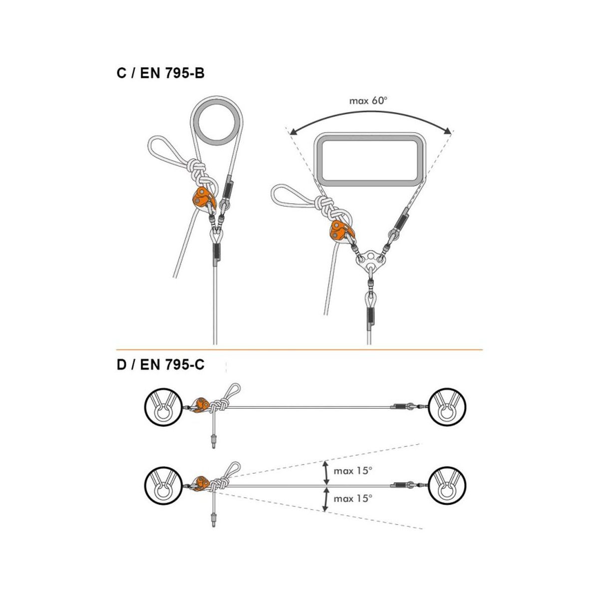 Możliwość podłączenia do bocznych punktów mocowania (zgodnie z EN 358) w pełnej uprzęży do pracy na słupach lub pylonach, a także do brzusznego punktu mocowania (zgodnie z EN 813) do pracy na pochyłych powierzchniach, gdzie nie ma ryzyka wahadła.