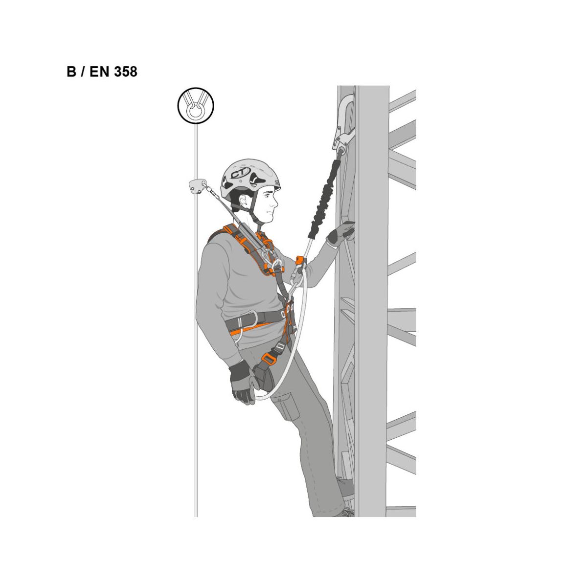 - Zastosowanie: pozycjonowanie pracy (EN 358), tymczasowe kotwienie poziome (EN 795‑B/C), stosowany jako element opuszczania (EN 12841‑C)
