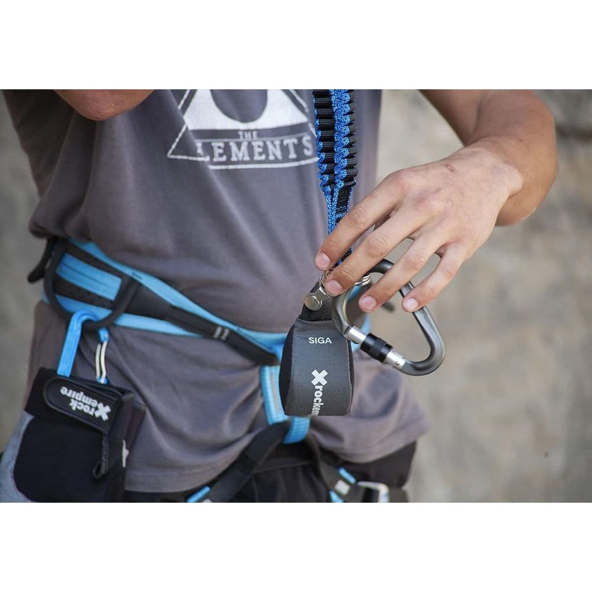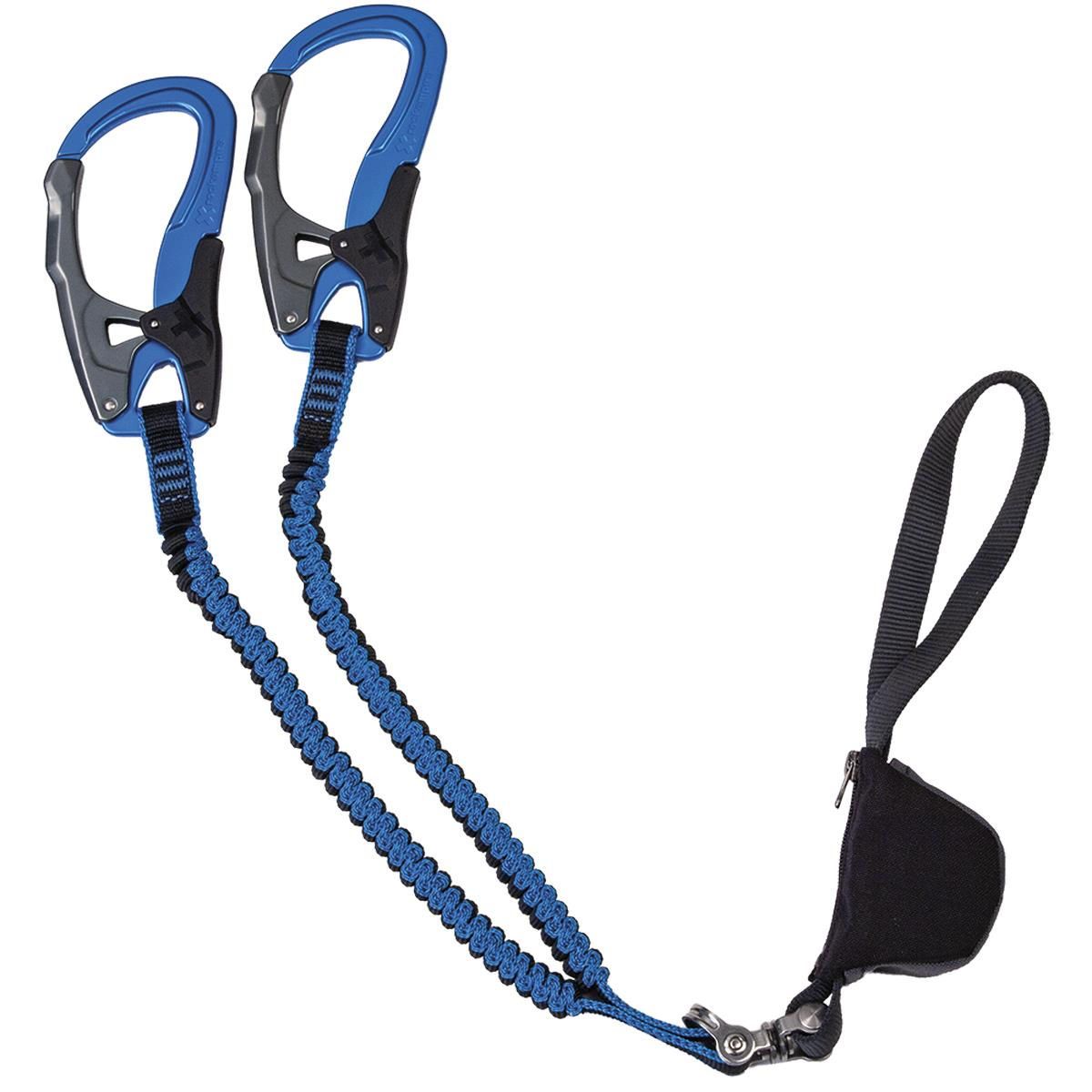 Lekka, nowoczesna lonża Via Ferrata Rock Empire Siga wyposażona w duże, ale bardzo lekkie karabinki.