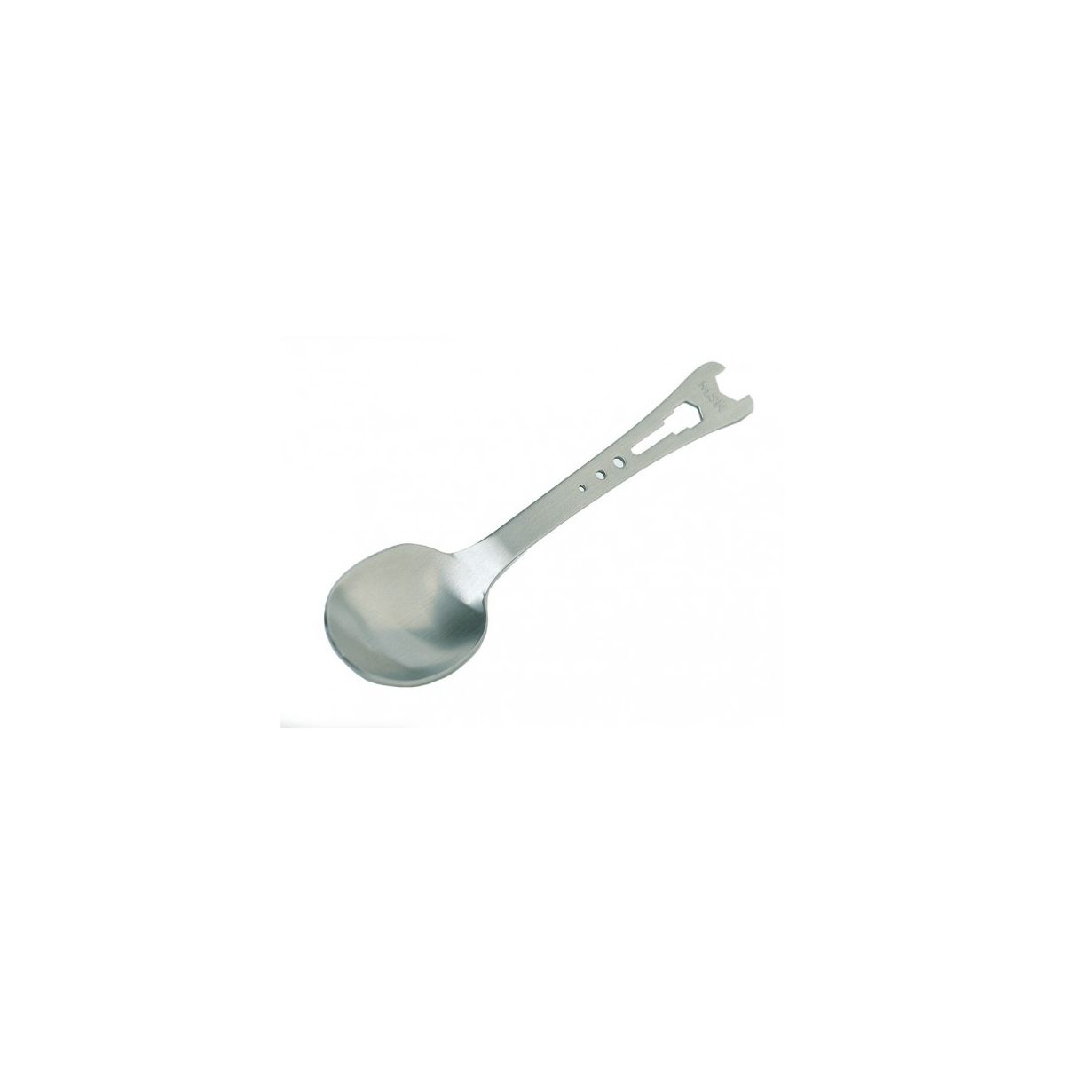Łyżka ze stali nierdzewnej połączona z narzędziem do konserwacji kuchenek wielopaliwowych MSR.