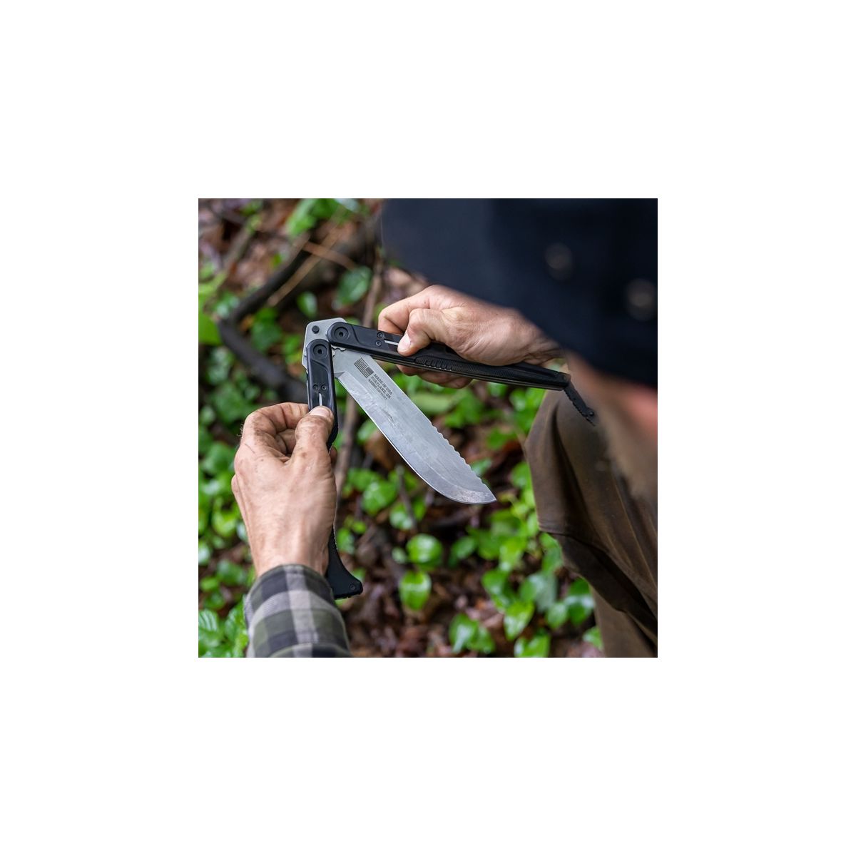 Składa i rozkłada się ją na zasadzie noża motylkowego, dzięki czemu jej rozmiar jest w przybliżeniu o połowę mniejszy niż klasycznej maczety. Wyposażono ją w poczwórny system blokowania ostrza w trzech różnych pozycjach. Zapewnia to bezpieczną pracę przy różnym stopniu naprężenia narzędzia.