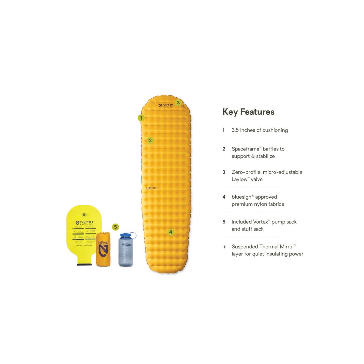 NEMO Equipment Tensor Trail Ultralight Insulated – Regular Mummy to ultralekka, 3-sezonowa mata turystyczna w wersji o zwężanym, "mumowatym" kształcie. Przeznaczona dla osób szukających kompromisu między niską wagą, izolacją termiczną a kompaktowym rozmiarem.