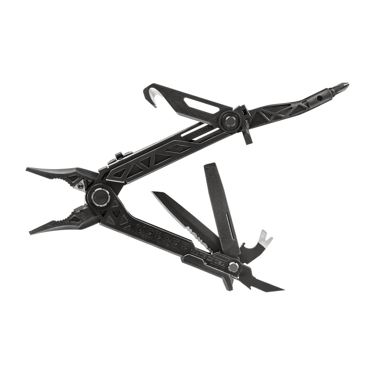 Multi-Tool marki Gerber wyposażony jest w 14 funkcjonalnych narzędzi, w tym podstawowe kombinerki jako główne narzędzie. Dodatkowo, posiada narzędzia takie jak szydło, otwieracz do butelek, pilnik, przecinak do pasów oraz ściągacz izolacji. Obsługa jest niezwykle prosta i intuicyjna dzięki mechanizmowi otwierania jedną ręką.