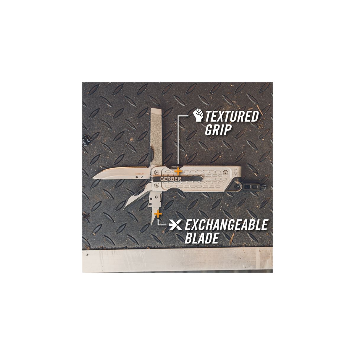 Zawiera mix ośmiu podstawowych narzędzi, które okażą się nieocenione w wielu sytuacjach dnia codziennego. Są to: ostrze gładkie, końcówka na bity, dwustronny bit, szydło, pilnik, dłuto oraz wymienne ostrze.
