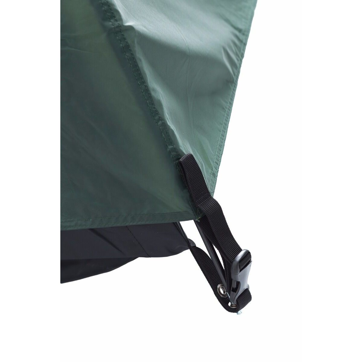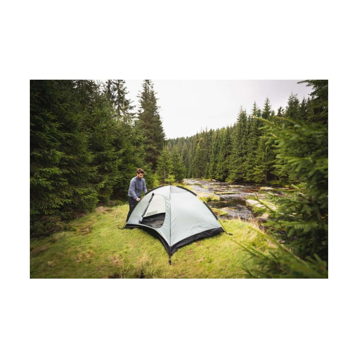 Jego konstrukcja typu igloo opiera się na dwóch krzyżujących się pałąkach z włókna szklanego, dzięki czemu namiot jest stabilny i łatwy do rozstawienia, nawet bez użycia szpilek. Ten praktyczny, wolnostojący model możesz rozbić niemal wszędzie – na trawie, żwirze czy twardym gruncie. W sytuacjach awaryjnych, jak nagły deszcz, szybki montaż może okazać się kluczowy. Dla zwiększenia stabilności w trudniejszych warunkach zalecamy jednak użycie odciągów i szpilek.