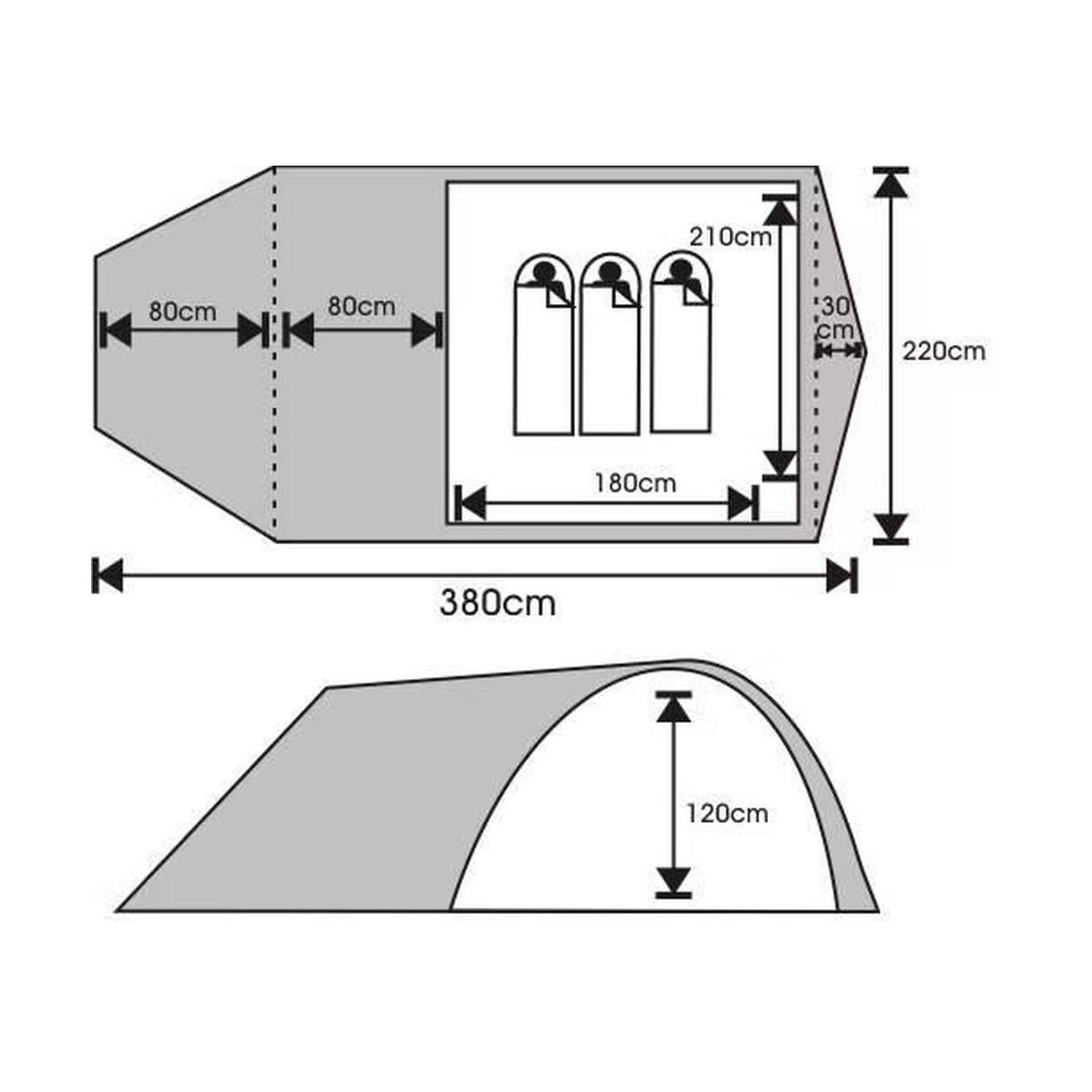 Wnętrze namiotu składa się z oddychającej sypialni o wymiarach 210 x 180 cm oraz zewnętrznego tropiku, który skutecznie chroni przed opadami i wiatrem. Wysokość 120 cm gwarantuje komfort podczas siedzenia i przemieszczania się wewnątrz.