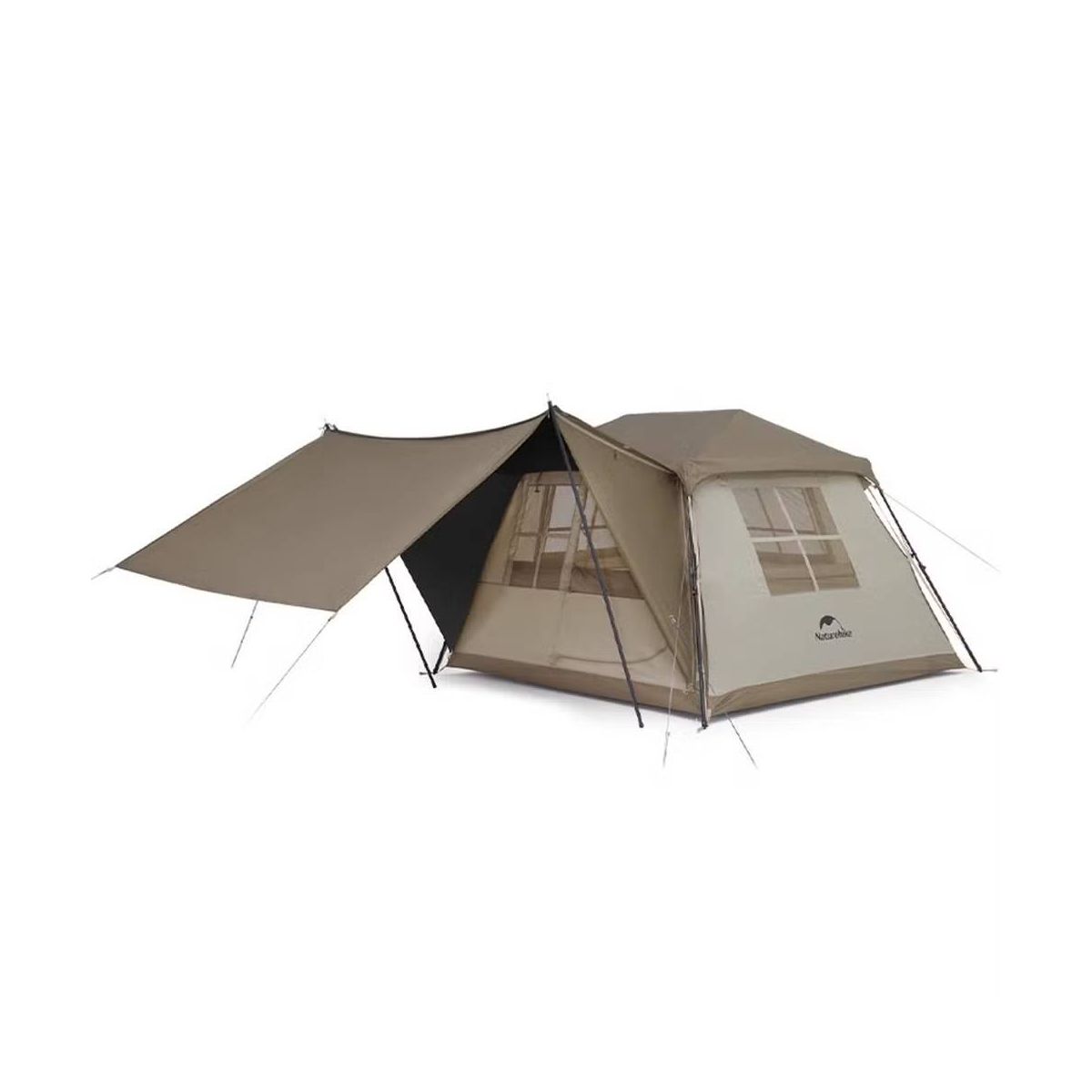 - Zadaszenie może być przekształcone w markizę, tworząc dodatkową przestrzeń do odpoczynku przed namiotem.