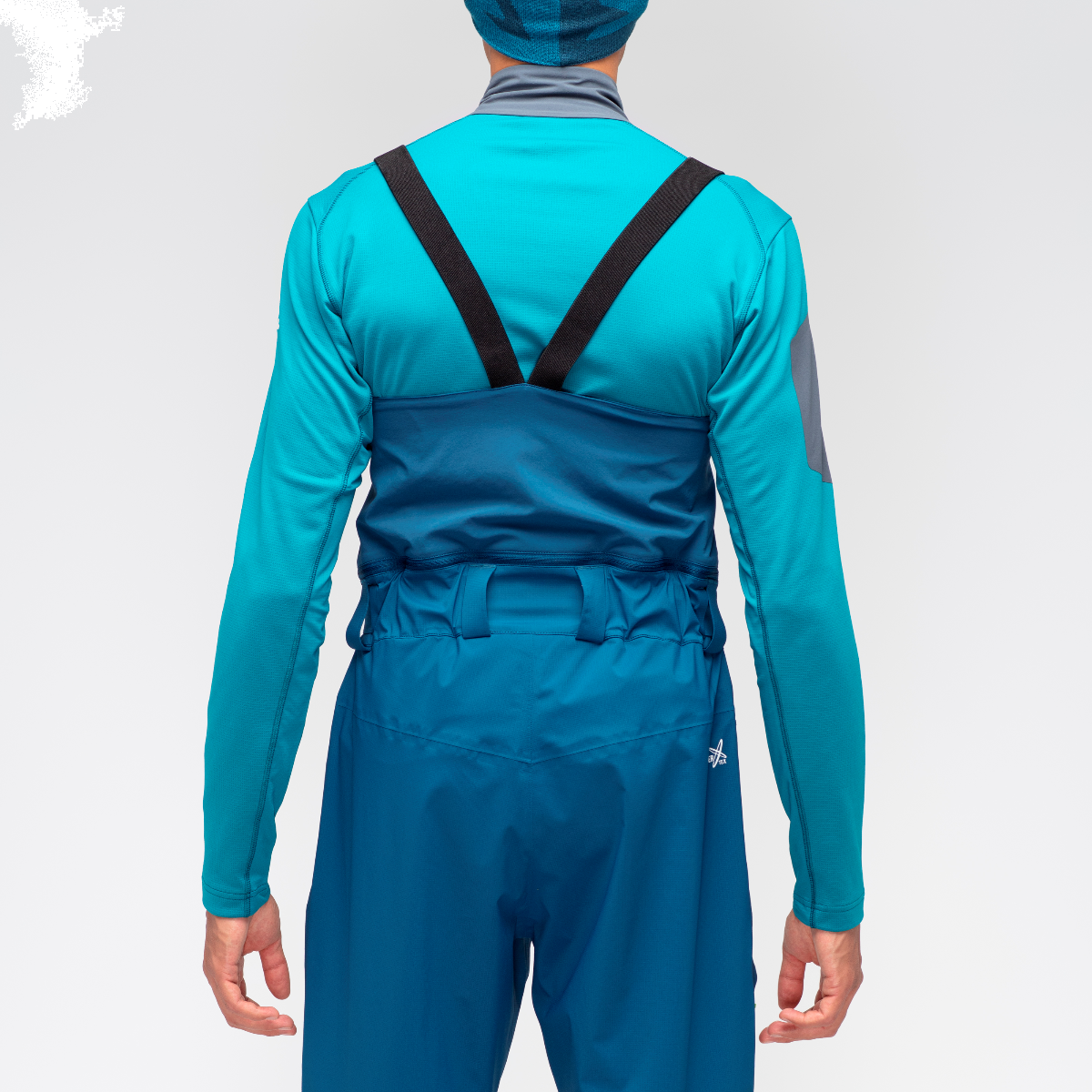 Dla uzyskania lepszej cyrkulacji powietrza spodnie wyposażono w zapinane na zamek otwory wentylacyjne na udach. Wnętrze dolnej części nogawki oraz jej brzeg wzmocniono niezwykle odpornymi na uszkodzenia włóknami CORDURA®, co zapewnia skuteczną ochronę przy kontakcie z krawędziami nart czy rakami. Model posiada wysoki, elastyczny, odpinany ochraniacz z szelkami dodatkowo blokujący podmuchy wiatru. Swoboda i szeroki zakres ruchu to natomiast zasługa ergonomicznego pasa i specjalnie wyprofilowanych kolan.