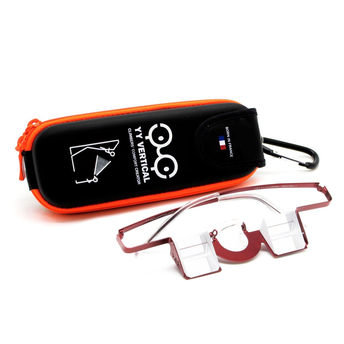 Okulary Y&Y Vertical Classic Red dla asekurantów, zapobiegają uciążliwemu zadzieraniu głowy ku górze podczas obserwacji wspinającego się.