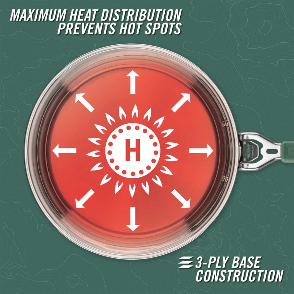 Wykonana ze stali nierdzewnej 304 i wyposażona w trójwarstwowe dno, zapewnia równomierne rozprowadzanie ciepła i eliminuje gorące punkty. Wysokie boki, kopuła do duszenia oraz zdejmowany silikonowy uchwyt sprawiają, że patelnia doskonale sprawdza się zarówno podczas biwaku, jak i w kuchni domowej. To solidne i funkcjonalne naczynie dla każdego, kto ceni gotowanie w terenie.