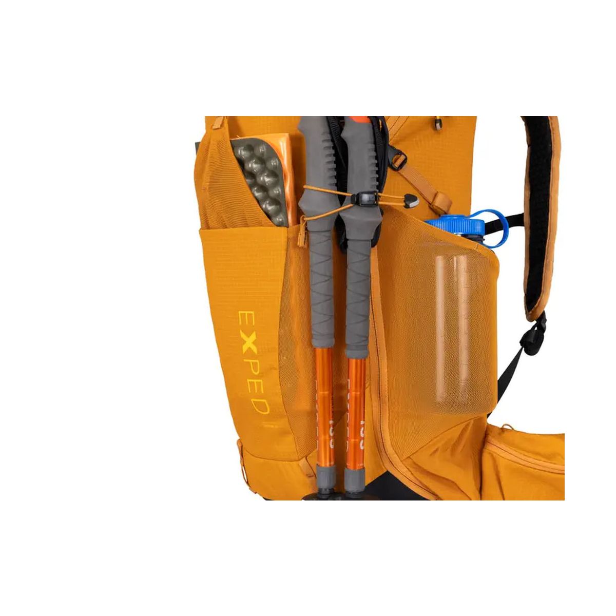 Szybki dostęp do głównej komory umożliwia szeroki zamek błyskawiczny biegnący wzdłuż całego boku. Plecak jest także kompatybilny z systemami hydracyjnymi – przegroda na bukłak znajduje się po zewnętrznej stronie. Wewnętrzne kieszenie siatkowe i zapinane na zamek pozwalają na wygodną organizację drobnych przedmiotów, a kieszenie zewnętrzne – w tym elastyczne boczne i frontowa z uchwytem na kask – zapewniają dodatkową przestrzeń np. na kurtkę czy butelkę. Specjalne pętle umożliwiają przypięcie kijków trekkingowych.