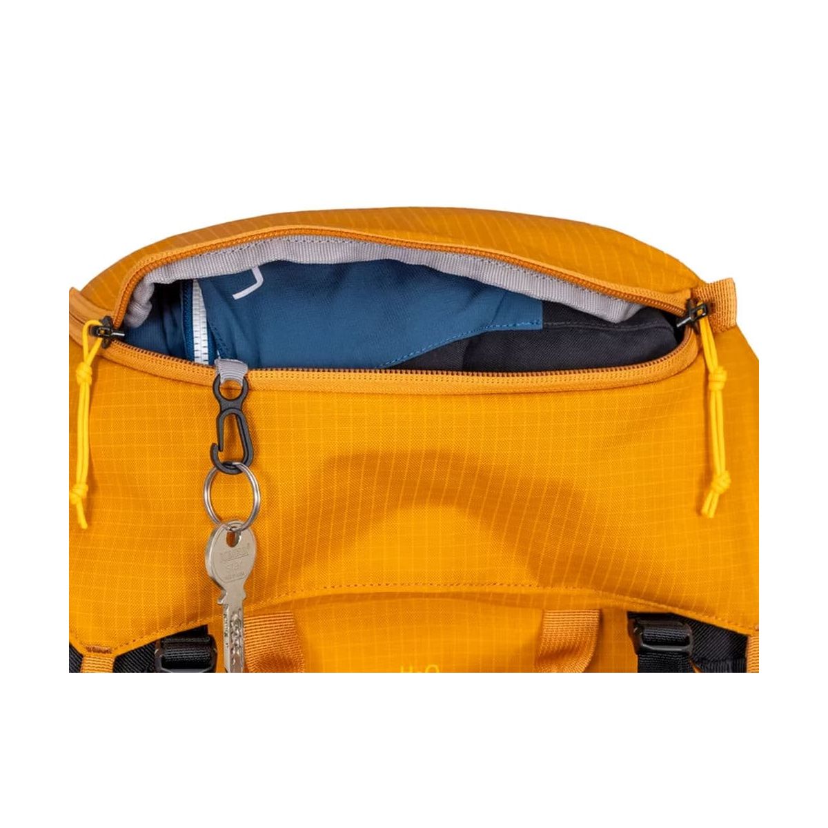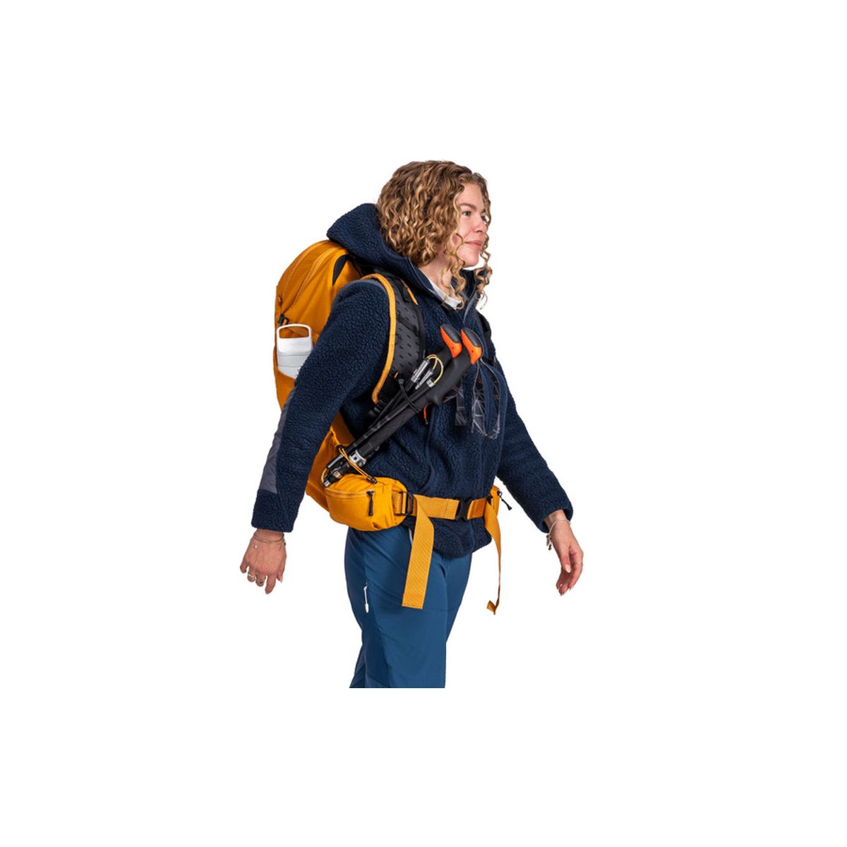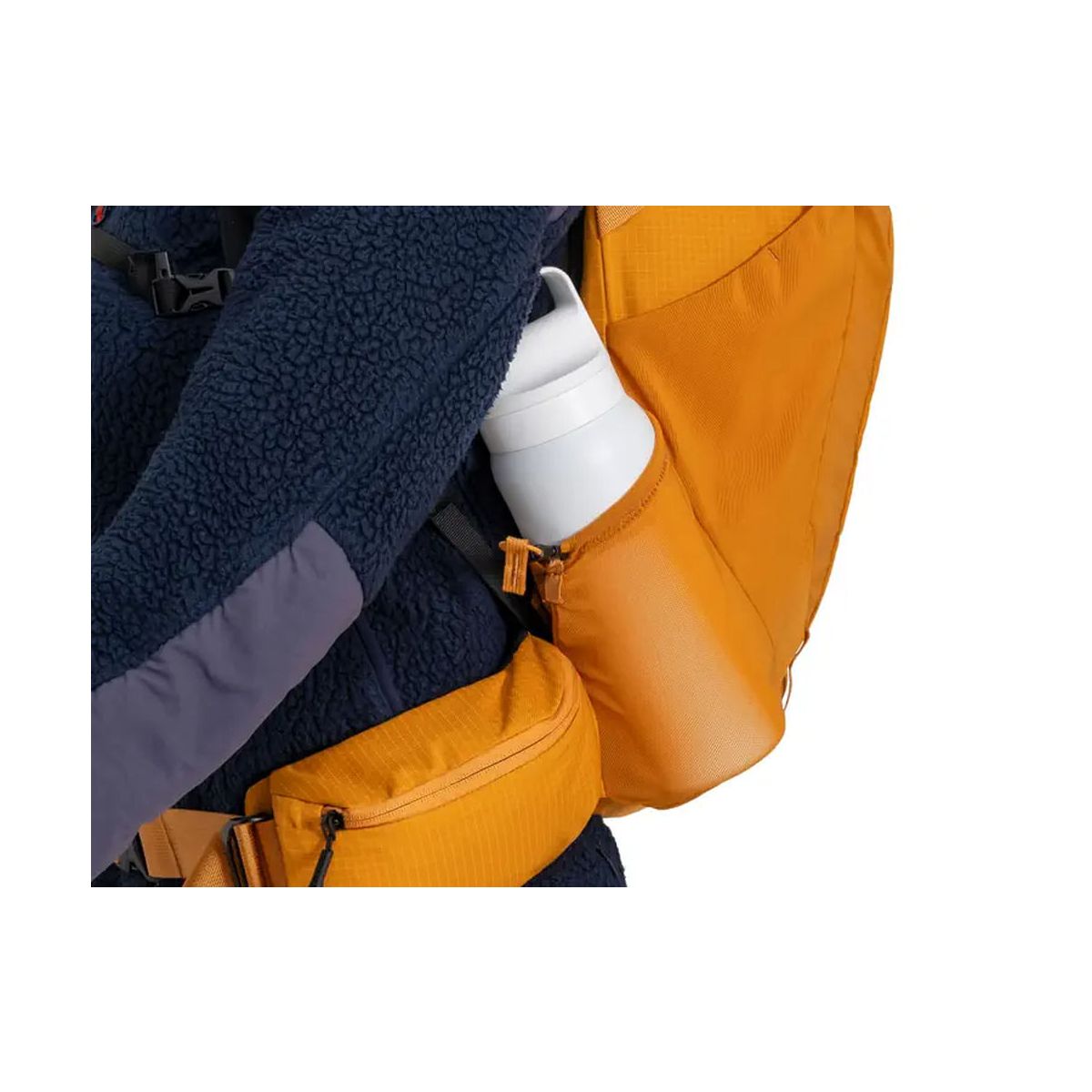 Zewnętrzne kieszenie z elastycznej siatki (na przodzie i bokach) pomieszczą mokre ubrania, kurtkę czy butelkę z wodą. Przednia kieszeń posiada praktyczny uchwyt na kask, a uchwyty na kijki trekkingowe zwiększają funkcjonalność podczas górskich wypraw. W zestawie znajduje się zintegrowany pokrowiec przeciwdeszczowy z odblaskowym logo – dla lepszej ochrony i widoczności w złych warunkach.