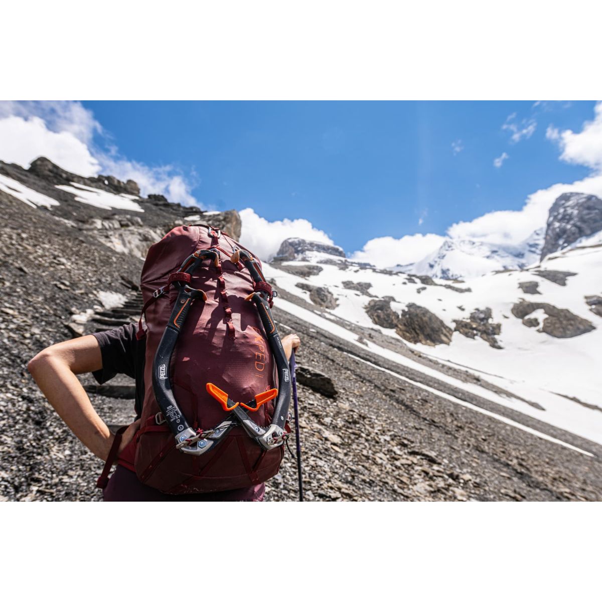 Taśmy daisy chain pozwalają na swobodne mocowanie wspinaczkowego ekwipunku: czekanów, kasku i etc. Linę możemy zamocować pod klapą i na klapie. Boczne paski kompresyjne, pętle na czekan można zdjąć lub dowolnie ustawić w razie potrzeby. Termoformowany tył i wygodne szelki zapewniają wysoki komfort noszenia, a pas biodrowy z dwoma elastycznymi kieszeniami w razie potrzeby możemy odpiąć.