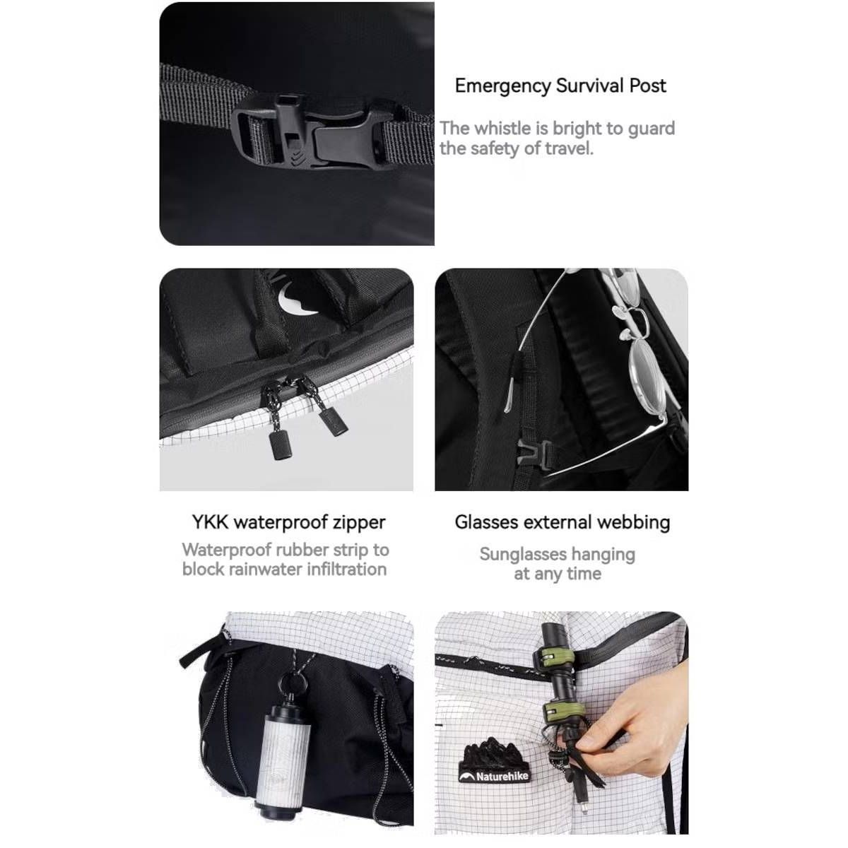 Tylna część plecaka została wyposażona w pionowe wkładki z pianki pokrytej oddychającą siateczką, które tworzą kanał wentylacyjny zapewniający chłodzenie pleców nawet podczas intensywnego wysiłku. Odpinany pasek biodrowy oraz regulowany pasek piersiowy dodatkowo zwiększają stabilność plecaka podczas ruchu. Górne zamknięcie plecaka na klapę z zamkiem zapewnia łatwy dostęp do zawartości, a boczne taśmy kompresyjne pomagają dostosować pojemność do aktualnych potrzeb. Funkcjonalne kieszenie, w tym dwie elastyczne boczne oraz duża kieszeń na przodzie, umożliwiają wygodne przechowywanie i organizację wyposażenia.