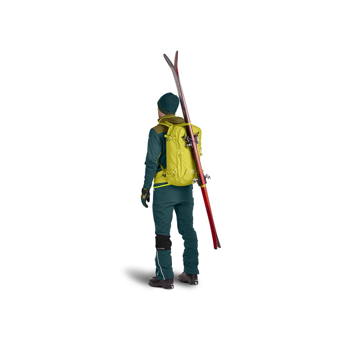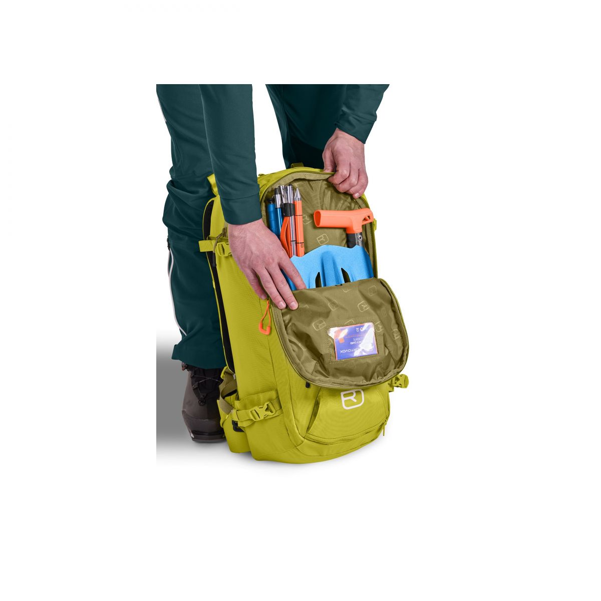 Charakterystyczną cechą wszystkich plecaków marki Ortovox jest specjalna komora na sondę i łopatę lawinową - znajduje się ona na frontowym panelu plecaka umożliwiając szybki dostęp. Plecak posiada możliwość przypięcia nart: mocowanie A-Skifix + D-Skifix (klasyczne, diagonalne), snowboardu i rakiet śnieżnych oraz mocowanie czekanów, kijków, kasku i liny.