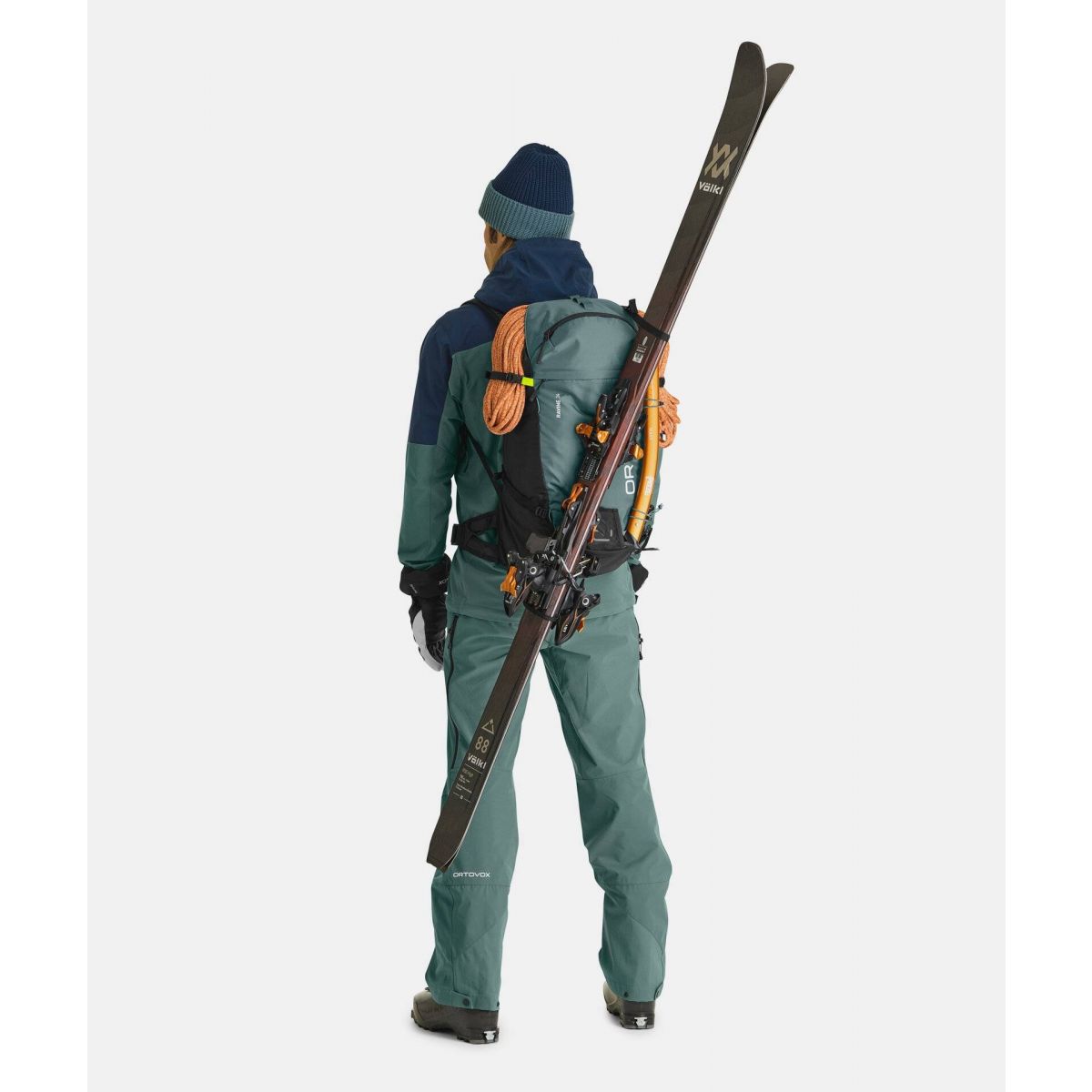 W związku z tym, że skitouring nie ogranicza się do pokonywania tylko ustalonych tras narciarskich Ortovox wyposażył plecak w systemy umożliwiające zamocowanie czekanów, kijków, liny i wszystkiego czego potrzeba na wyjście w góry.
