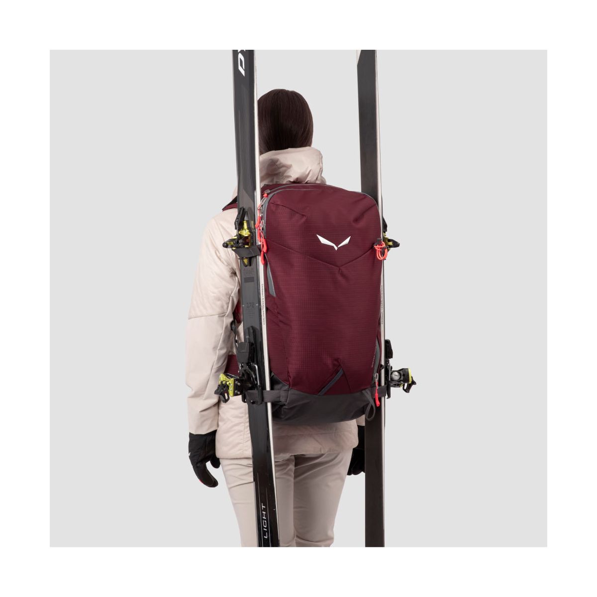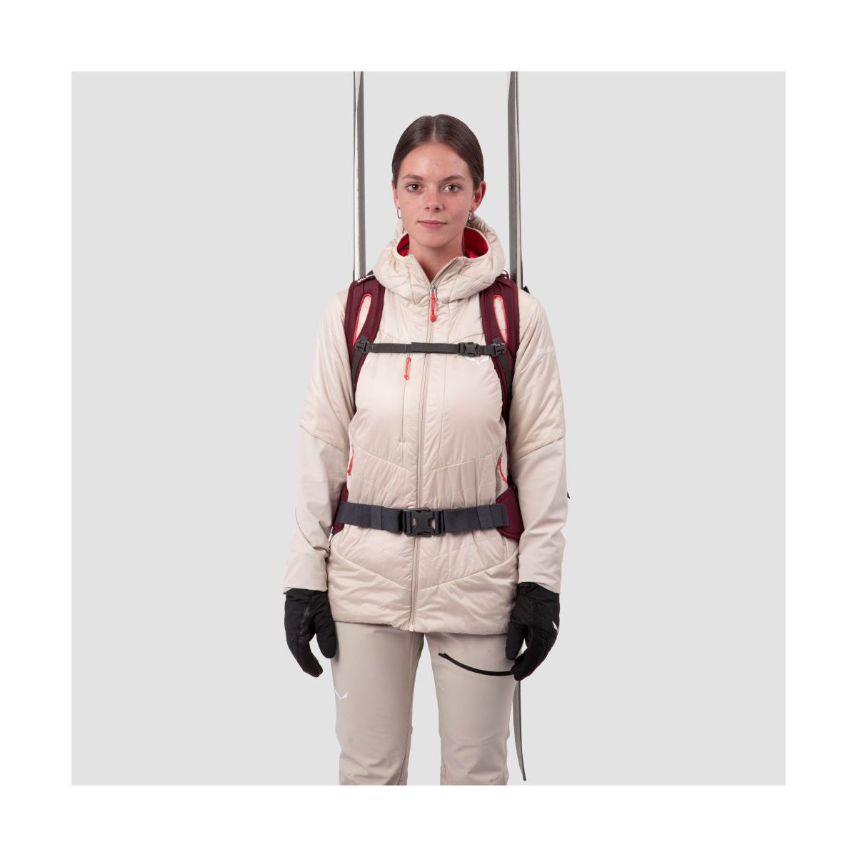 Damski 28-litrowy plecak dla miłośniczek skitouringu i wycieczek na rakietach śnieżnych oferujący liczne opcje mocowania sprzętu i krój dostosowany do kobiecego ciała.