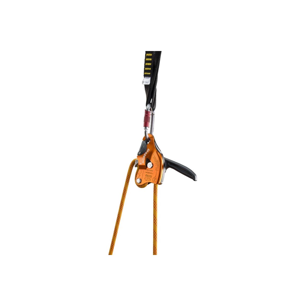 Dodatkowo, system bezpieczeństwa EBS (Extraordinary Braking System) automatycznie redukuje prędkość zjazdu w przypadku nieumyślnego całkowitego otwarcia dźwigni, minimalizując ryzyko wypadku. Dźwignia bezpieczeństwa na ruchomym kołnierzu ułatwia wsuwanie liny podczas przechodzenia przez punkty frakcjonowania, zwiększając wygodę użytkowania.