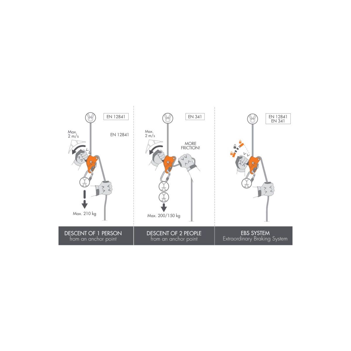 Urządzenie posiada ostrogę hamującą, która zwiększa tarcie na linie podczas zjazdu, zapewniając skuteczniejszą kontrolę bez konieczności użycia dodatkowego łącznika. Ulepszony kształt ostrogi zwiększa efektywność pracy. Wielofunkcyjna dźwignia sterownicza z systemem automatycznego przywoływania pozwala na płynny zjazd z kontrolowaną prędkością oraz zatrzymanie w dowolnym punkcie bez potrzeby przywiązywania urządzenia.