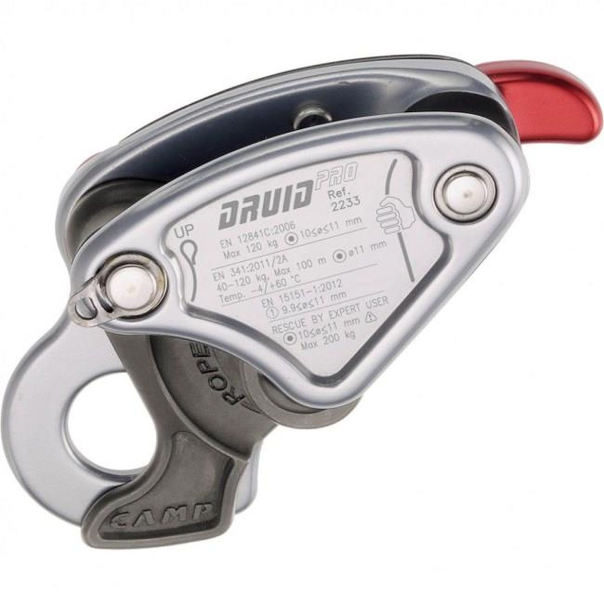Lekki i kompaktowy przyrząd zjazdowy Camp Druid Pro Silver z systemem automatycznego hamowania, przeznaczony do prac na wysokościach oraz ratownictwa wysokościowego.