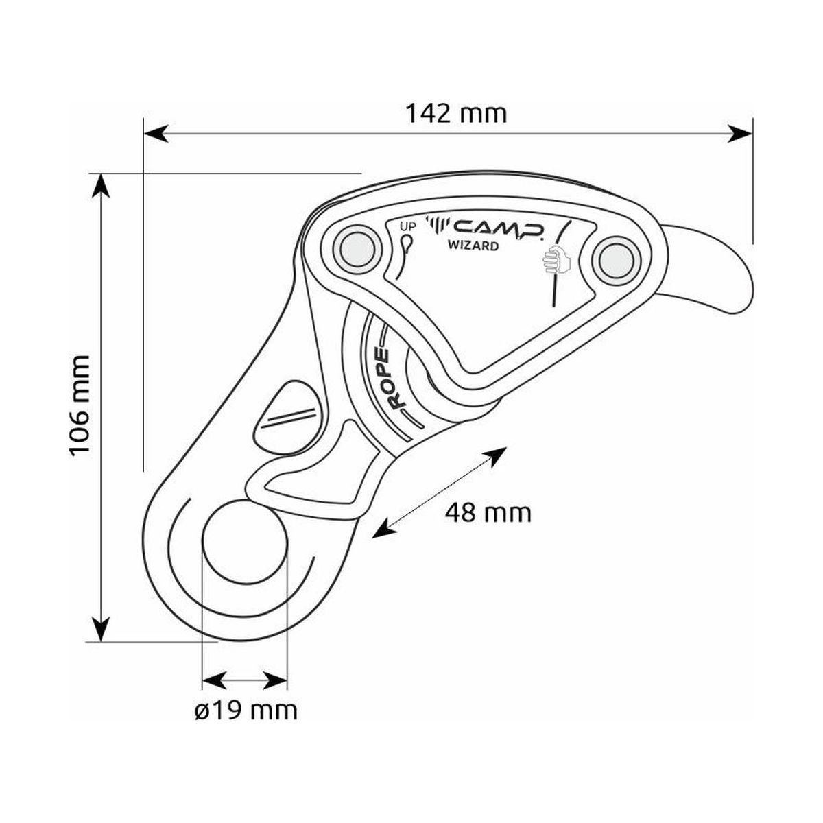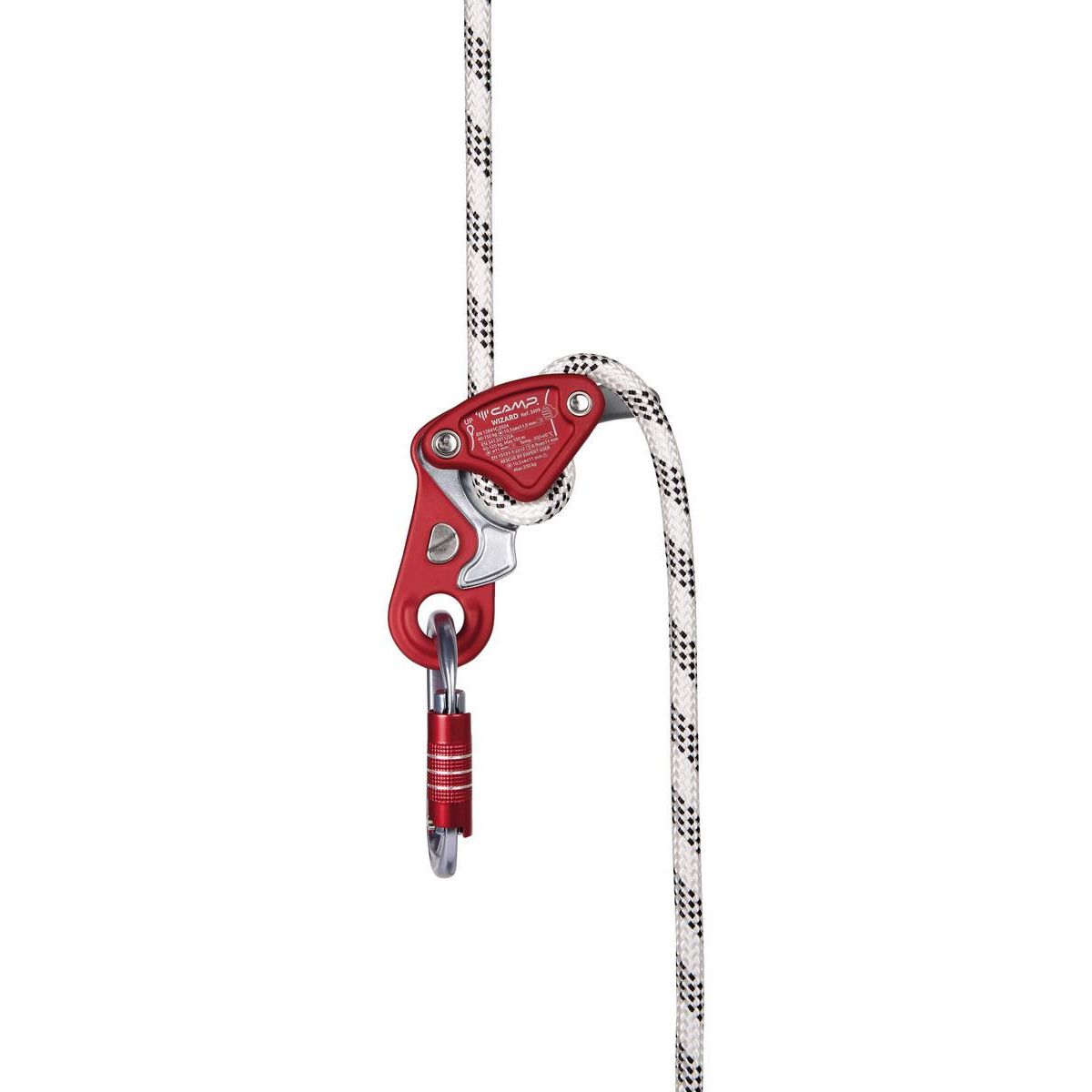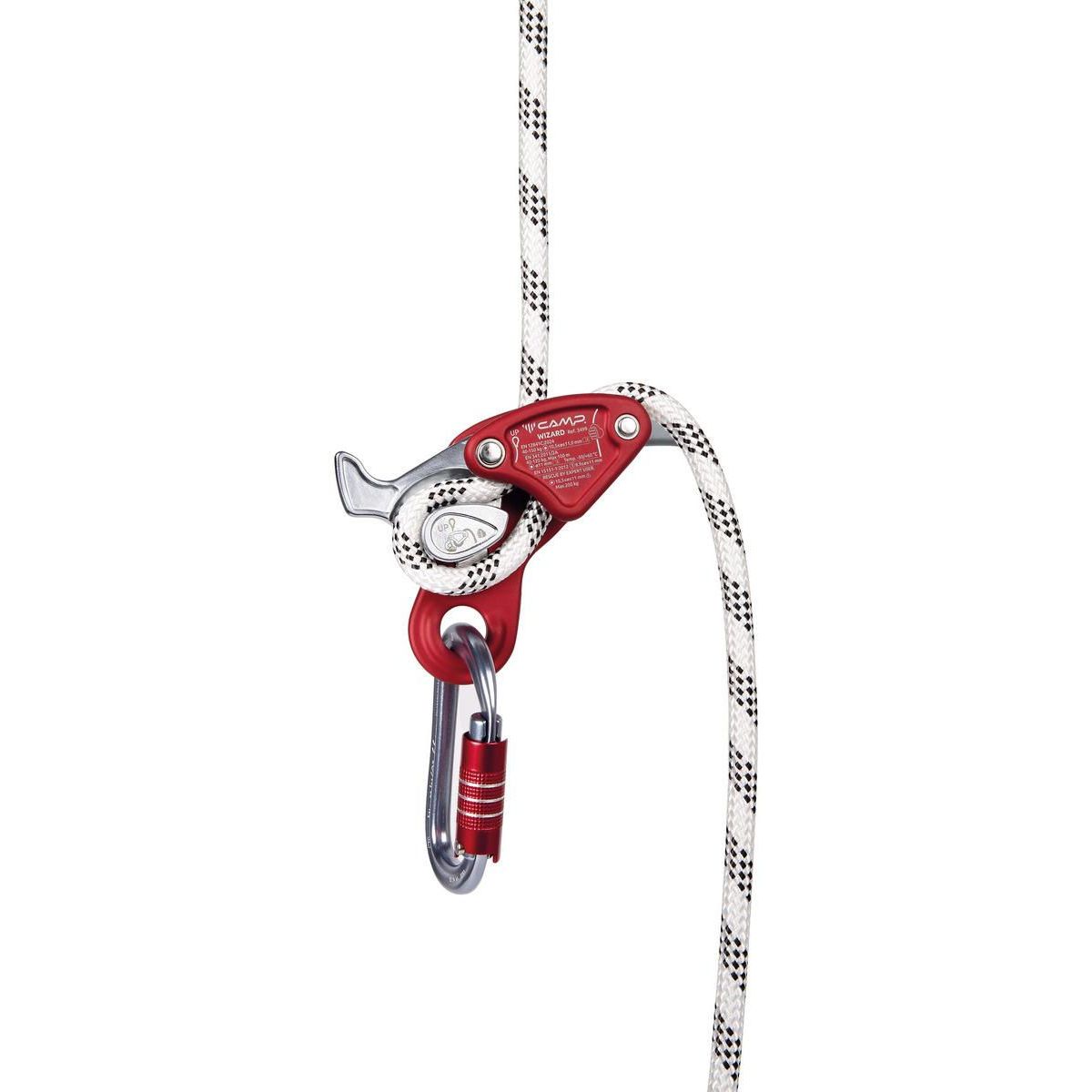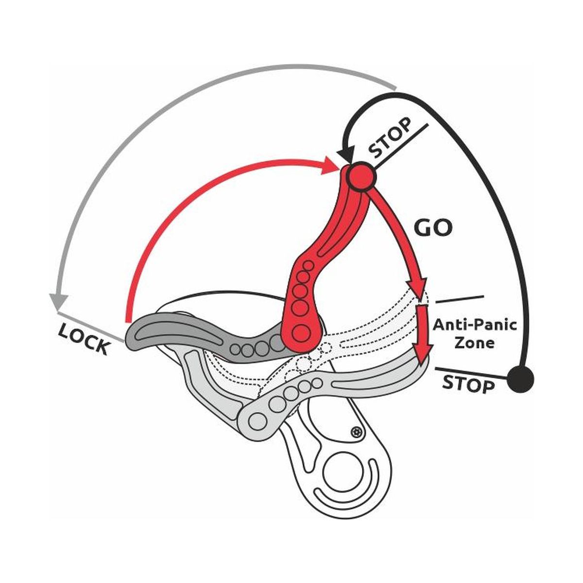 Dzięki funkcji blokowania krzywki przy wkładaniu lub wyjmowaniu liny, Wizard umożliwia łatwe i bezpieczne wpinanie, pozostając jednocześnie przypiętym do uprzęży użytkownika. Dodatkowo, antypaniczna funkcja w dźwigni automatycznie zatrzymuje zjazd, jeśli uchwyt zostanie zbyt mocno pociągnięty – zapobiegając niekontrolowanemu przyspieszeniu.