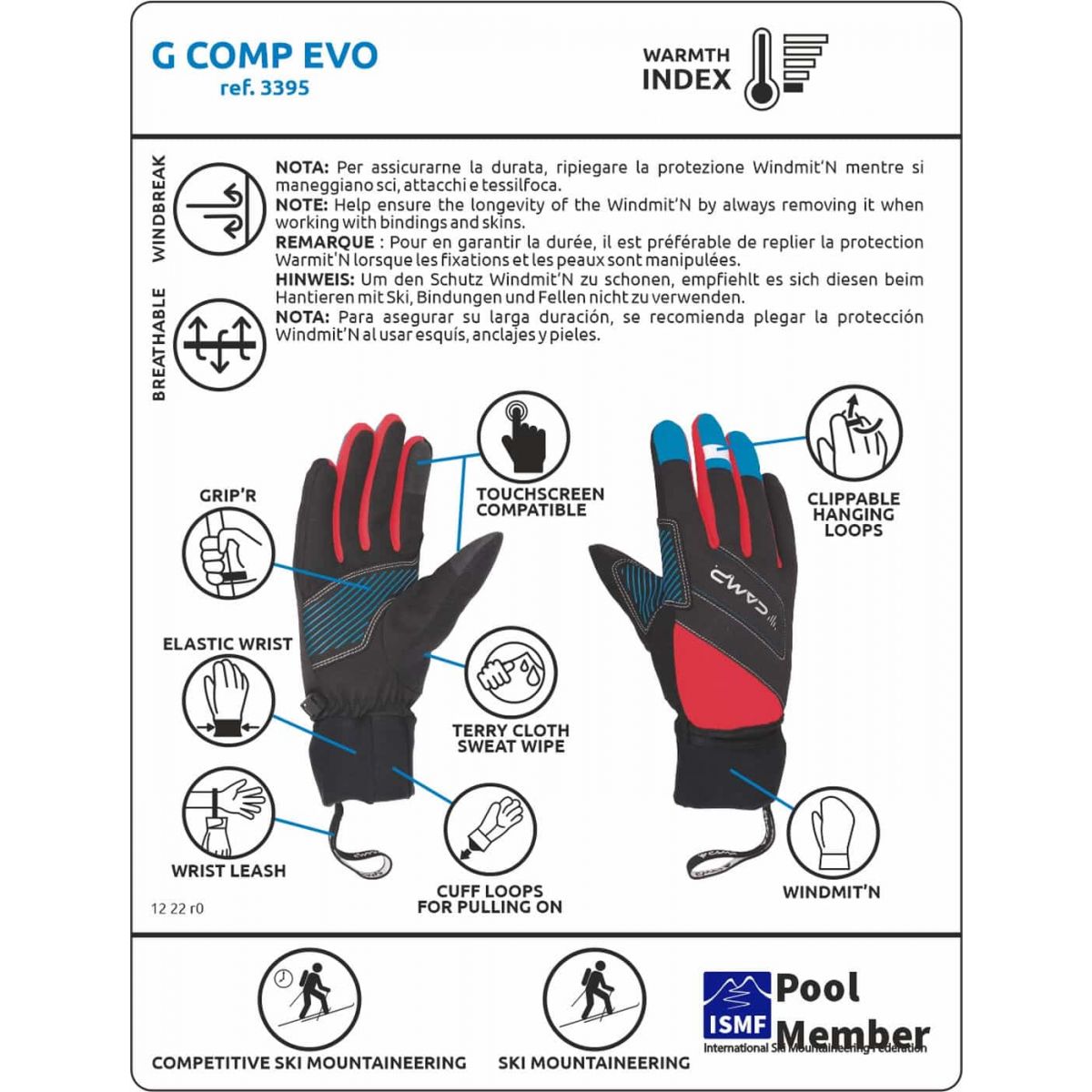 Camp G Comp Evo to miękkie, chwytne i oddychające rękawice wyposażone w dodatkową łapawicę Warmit’N. Zaprojektowane do uprawiania profesjonalnego narciarstwa wysokogórskiego i górskich aktywności zimowych.