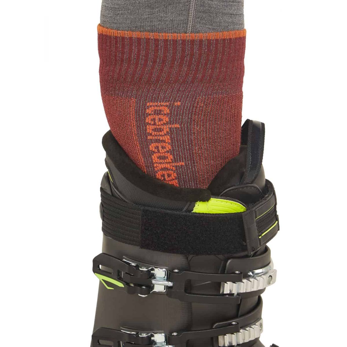 Anatomiczny nosek dopasowuje się osobno do lewej i prawej stopy, gwarantując idealne przyleganie, a profilowana wyściółka zwiększa komfort i amortyzację. Dzięki wsparciu Achillesa skarpeta pozostaje na miejscu, eliminując ryzyko zsuwania się, a dodatkowe wzmocnienie w okolicy kostki zapewnia lepszą stabilność. Bezszwowe wykończenie w okolicach palców minimalizuje ryzyko otarć i nie zwiększa objętości wewnątrz buta. To niezawodny wybór na stoki narciarskie i inne zimowe aktywności.