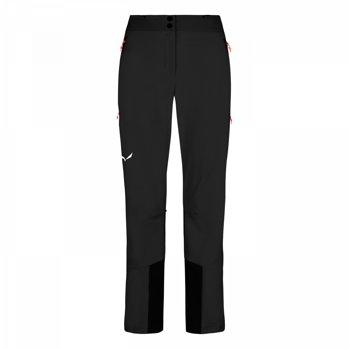 Damskie wytrzymałe spodnie skitourowe Salewa Sella Durastretch (kolor Black), wykonane z wodoodpornego, oddychającego materiału softshellowego.