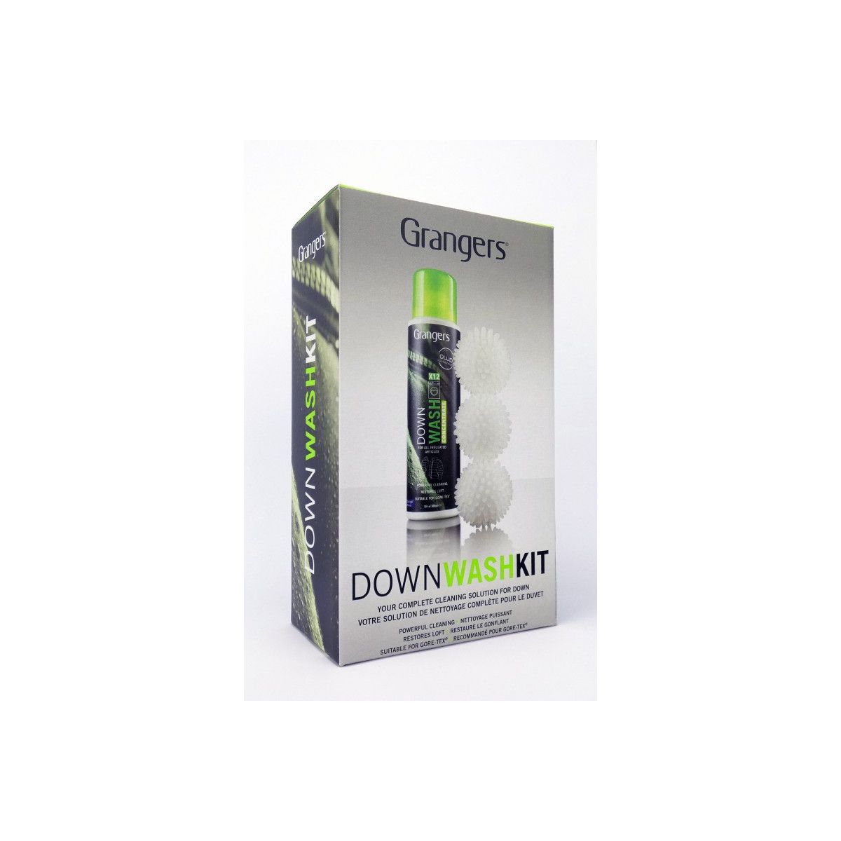 Zestaw do prania puchu Grangers Down Wash Kit, zawierający specjalistyczny płyn do prania puchowego ekwipunku turystycznego oraz trzy miękkie kulki do suszenia.