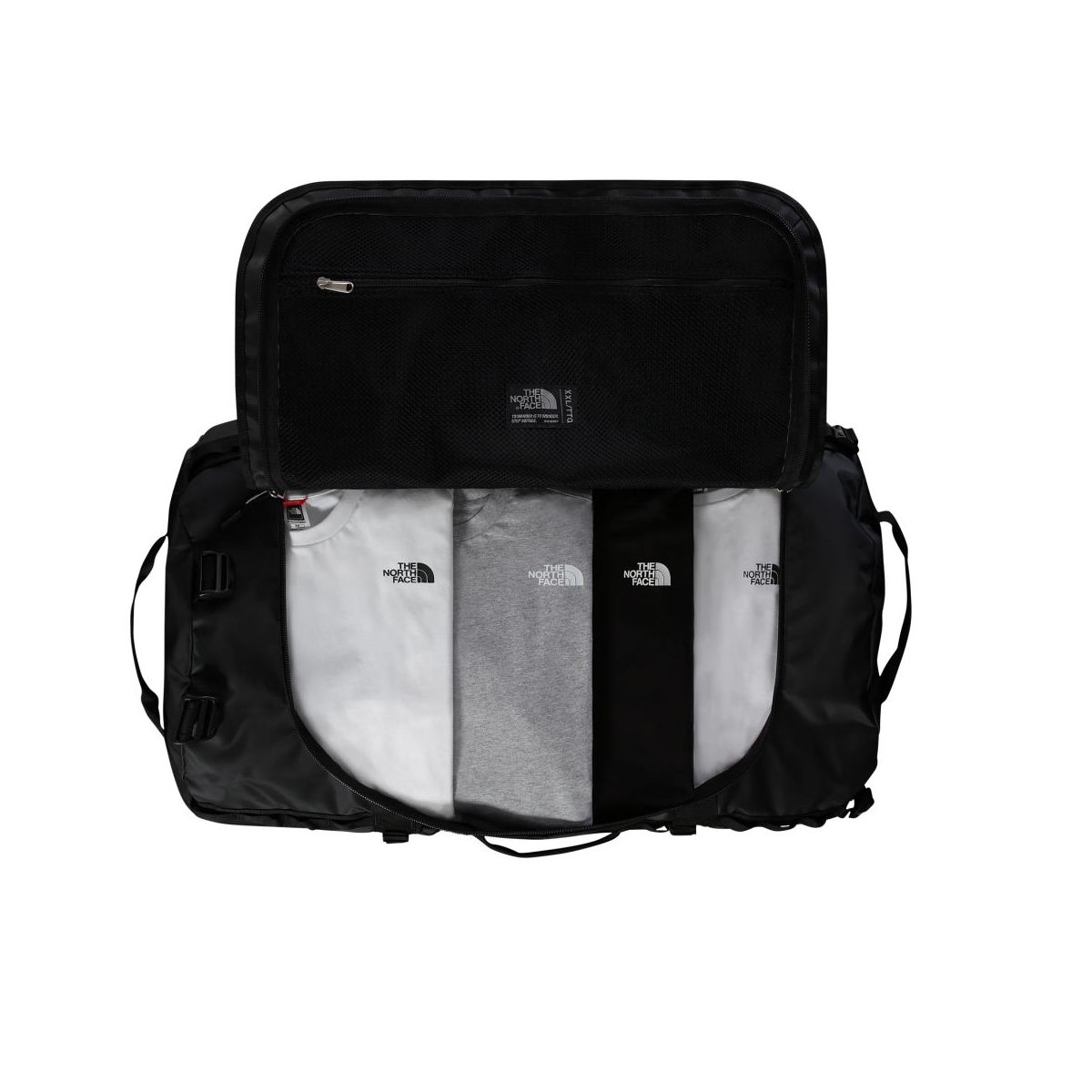 Base Camp Duffel posiada 3 opcje noszenia: w rękach za pomocą dwóch wygodnych uchwytów transportowych, w ręce za pomocą dwóch wygodnych pasów spinanych razem oraz na plecach - odpinane, regulowane szelki nośne. Dodatkowo w wersji M torba posiada naszyte 2 taśmy typu "daisy chain" do troczenia.