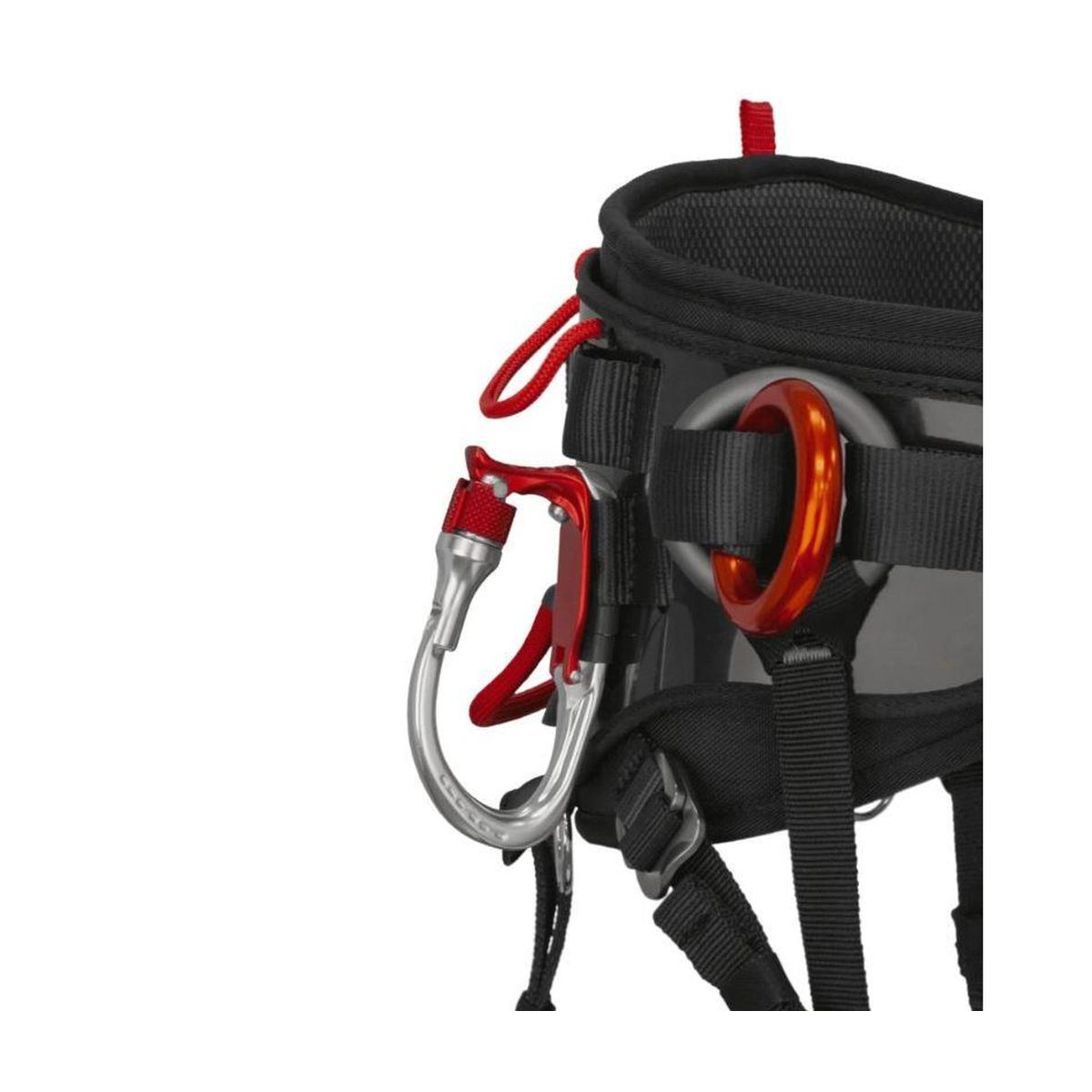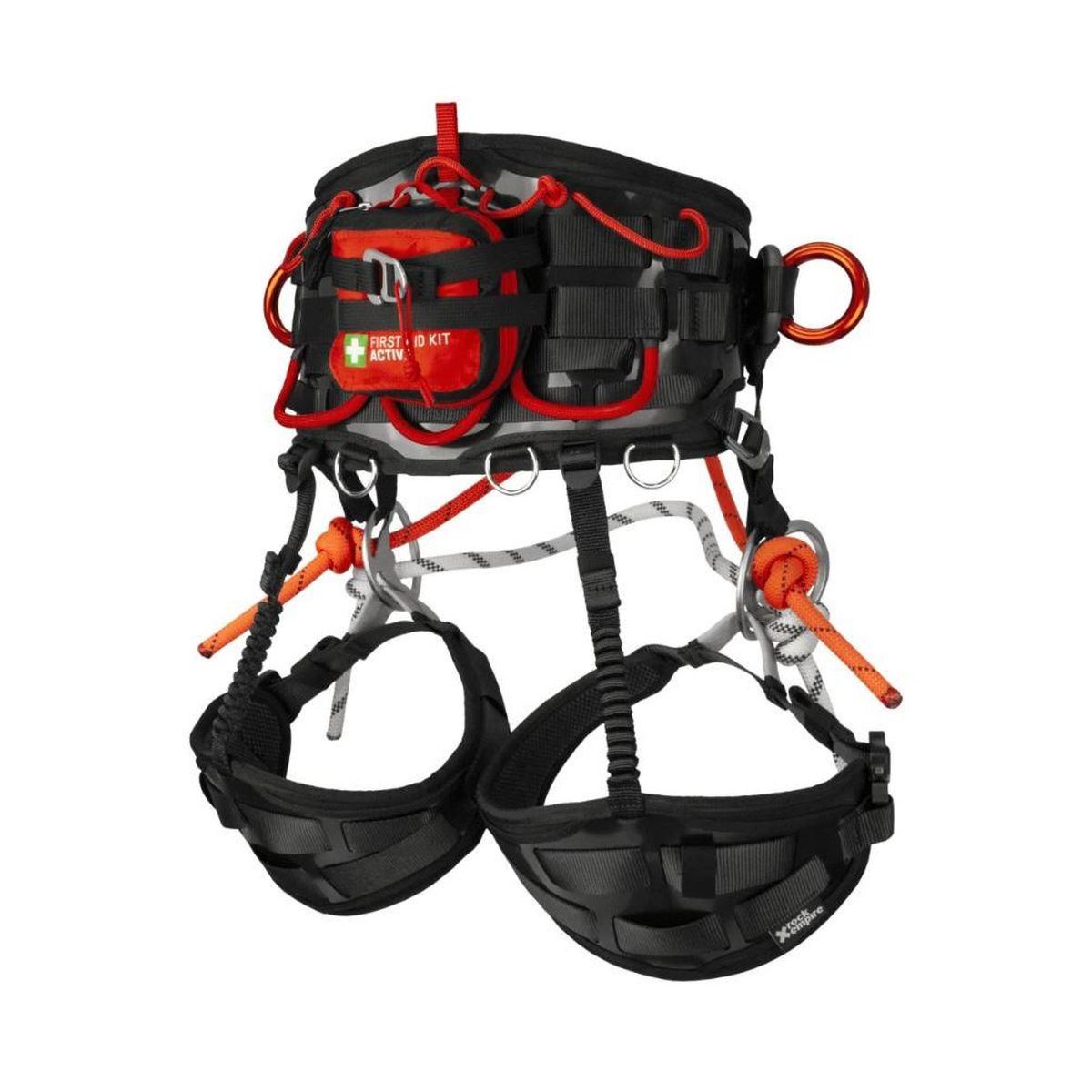 Szeroki pas biodrowy charakteryzuje się dużą liczbą punktów mocowania sprzętu, co daje użytkownikowi szerokie możliwości personalizacji. Po obu stronach znajdują się miejsca na duże karabinki do przenoszenia narzędzi, a także trzy klasyczne pętle na sprzęt. Otwory na linkę akcesoryjną (dołączoną do zestawu) pozwalają na tworzenie dodatkowych pętli zgodnie z indywidualnymi potrzebami użytkownika. Na odcinku lędźwiowym pasa znajduje się pasek z aluminiowym hakiem do mocowania apteczki (brak w zestawie) oraz pętla do przypięcia opcjonalnej uprzęży naramiennej (np. do mocowania przyrządu zaciskowego na klatce piersiowej – brak w zestawie).