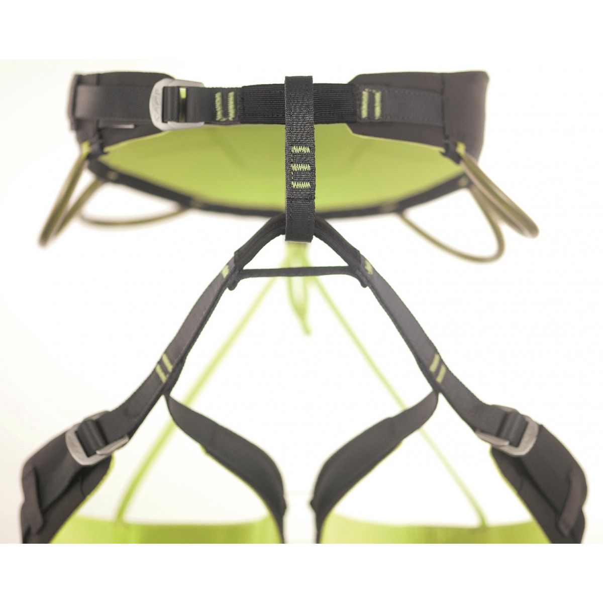 Wysoki komfort użytkowania zapewniają termicznie formowane, na ciepło pianki. Cztery usztywniane szpejarki pomieszczą wystarczająco dużo sprzętu i są łatwe w obsłudze. Dodatkowa, wytrzymała pętla z tyłu uprzęży może służyć jako szpejarka, lub miejsce zamocowania worka z magnezją. Solidna konstrukcja uprzęży zapewnia wysoką wytrzymałość i żywotność produktu.