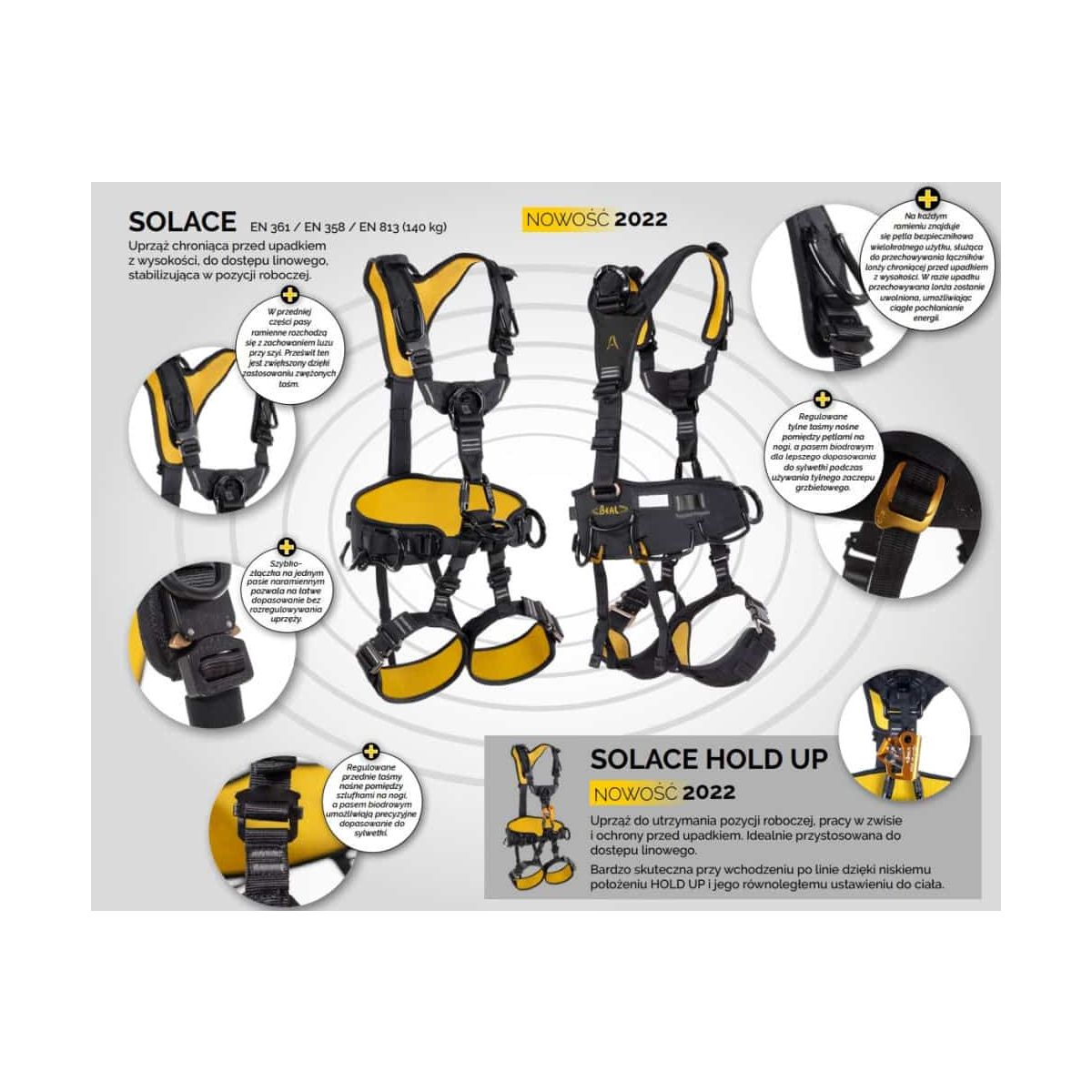 BEAL SOLACE to zaawansowana, ergonomiczna uprząż pełnego typu przeznaczona do profesjonalnych prac na wysokości, dostępu linowego oraz ratownictwa. Jej konstrukcja łączy w sobie trzy funkcje: ochronę przed upadkiem, pozycjonowanie oraz możliwość pracy w podwieszeniu. Dzięki szerokim możliwościom regulacji i zastosowaniu wyściełanych pasów, uprząż zapewnia wysoki komfort nawet podczas długotrwałego użytkowania. To idealne rozwiązanie dla osób poszukujących solidnego, certyfikowanego i wygodnego sprzętu do pracy w wymagających warunkach.