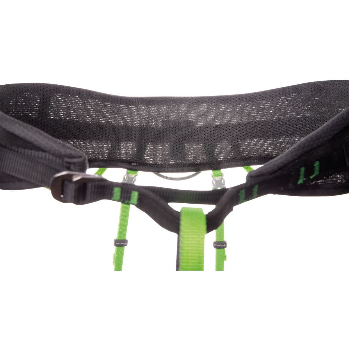 Uprząż wyposażona jest także w zróżnicowaną kolorystycznie pętlę asekuracyjną, dwie zszyte pętle na karabinki Hub racking oraz opuszczane siedzisko z szybkozapinanymi plastikowymi klamrami, co czyni ją niezwykle technicznym i wszechstronnym wyborem.
