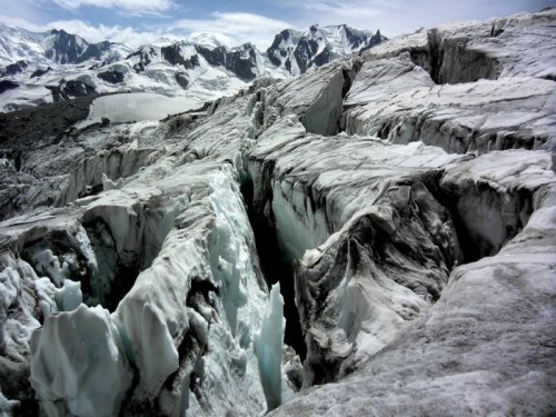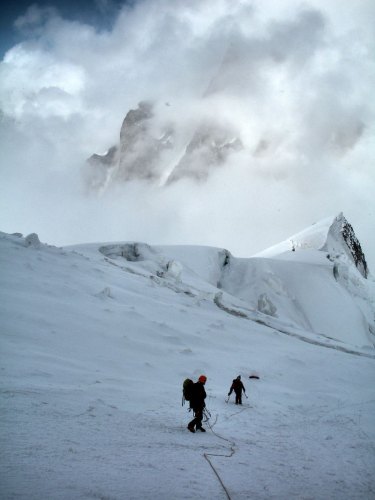 Mimo sporego zachmurzenia ruszyliśmy do ataku o godzinie 5 nad ranem (wg prognoz przesłanych z Polski opady miały być do niedzieli). Od plateau oddzielało nas solidne przełamanie lodowca, które tworzyło niezwykłą mozaikę szczelin, zawieszonych seraków i niewielkich mostów śnieżnych. Poruszaliśmy się wolno ważąc każdy krok. Związani liną, przypominaliśmy trochę olbrzymiego krocionoga, który klucząc pośród ślepych zaułków, wije się, to znowu przystaje, by zaraz ruszyć we właściwym kierunku.