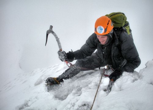 Zdecydowałem się ruszyć tą drogą. Szybko ściągnąłem Kubę, i chwilę później pod skałami przetrawersowałem do rynny. Mimo kopnego śniegu droga okazała się dużo łatwiejsza niż sądziłem. Tuż przed trudnym miejscem wkręciłem dwie śruby, spiąłem poślady i szybko przewspinałem ten odcinek. Byłem na ostatnim polu lodowym. Jeden wyciąg nad nami, Maciek i Mikołaj zbliżali się do podstawy skał, które tworzyły postrzępioną grań szczytową. Na nasze głowy posypały się kamienie i kruchy lód. Byliśmy dokładnie w linii ostrzału chłopaków. Kolejne minuty przepełnione były soczystymi słowami, które szybowały w ich stronę. Zatrzymali się, a my trawersem uciekliśmy na prawo.