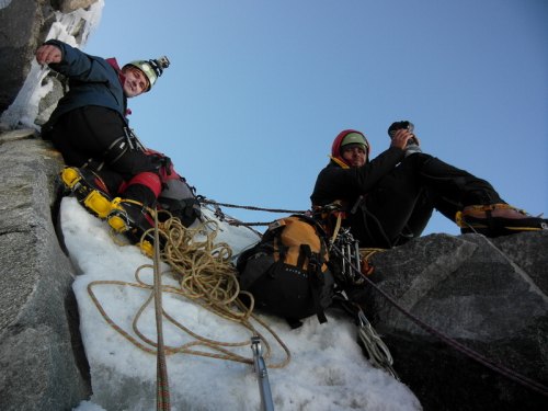Na przełączce siedzieliśmy około godziny. W zasadzie trudno to było nazwać siedzeniem. Jedyne dobre miejsca zajęli Maciek i Mikołaj. Ja i Kuba musieliśmy wisieć. Mimo lekkich niedogodności, upajaliśmy się tą chwilą. Zdjęcia, herbata i czekolada – prawdziwa słodycz wspinania. Byliśmy pewni, że wejdziemy na wierzchołek. W końcu pozostało nam mniej niż 200 metrów przewyższenia, a do zachodu słońca było jeszcze tak daleko. Jakże się myliliśmy.