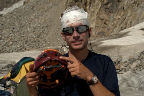 Ostatni zjazd założyliśmy koło godziny 8 rano. Kilkadziesiąt minut później siedzieliśmy i klarowaliśmy liny. Do szczeliny brzeżnej mieliśmy wciąż około dwustu metrów, ale już w łatwym terenie. Napięcie opadło, a jego miejsce zajęło otępienie, które nasiliło się, gdy tylko ogrzały nas pierwsze promienie słońca. Po zimnej nocy byliśmy wdzięczni za odrobinę ciepła, ale tylko przez moment. Chwilę później wszystko się zmieniło. Kamień pojawił się nagle. Leciał do nas ślizgiem, to znowu odbijał się, koziołkował, i nie widzieliśmy go, dopóki nie było już za późno. Głowa Mikołaja obficie krwawiła.