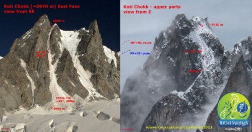 W trakcie całej wyprawy przeprowadziliśmy kilka ataków szczytowych. Naszym celem głównym był dziewiczy wierzchołek Koti Chok (5970 m), który na nasze nieszczęście obronił się dwukrotnie. Na jego południowo-wschodniej ścianie zrobiliśmy długą, 1200 metrową drogę, która zakończyła się jakieś 15 przed postrzępioną granią i około 50 metrów przed wierzchołkiem. Drogę w skali alpejskiej wyceniliśmy na D (bardzo trudna), na której napotkaliśmy lód o nachyleniu dochodzącym do 70 stopni (górne partie ściany). Góra miała dwa dominujące wierzchołki i kilka mniejszych turnic.